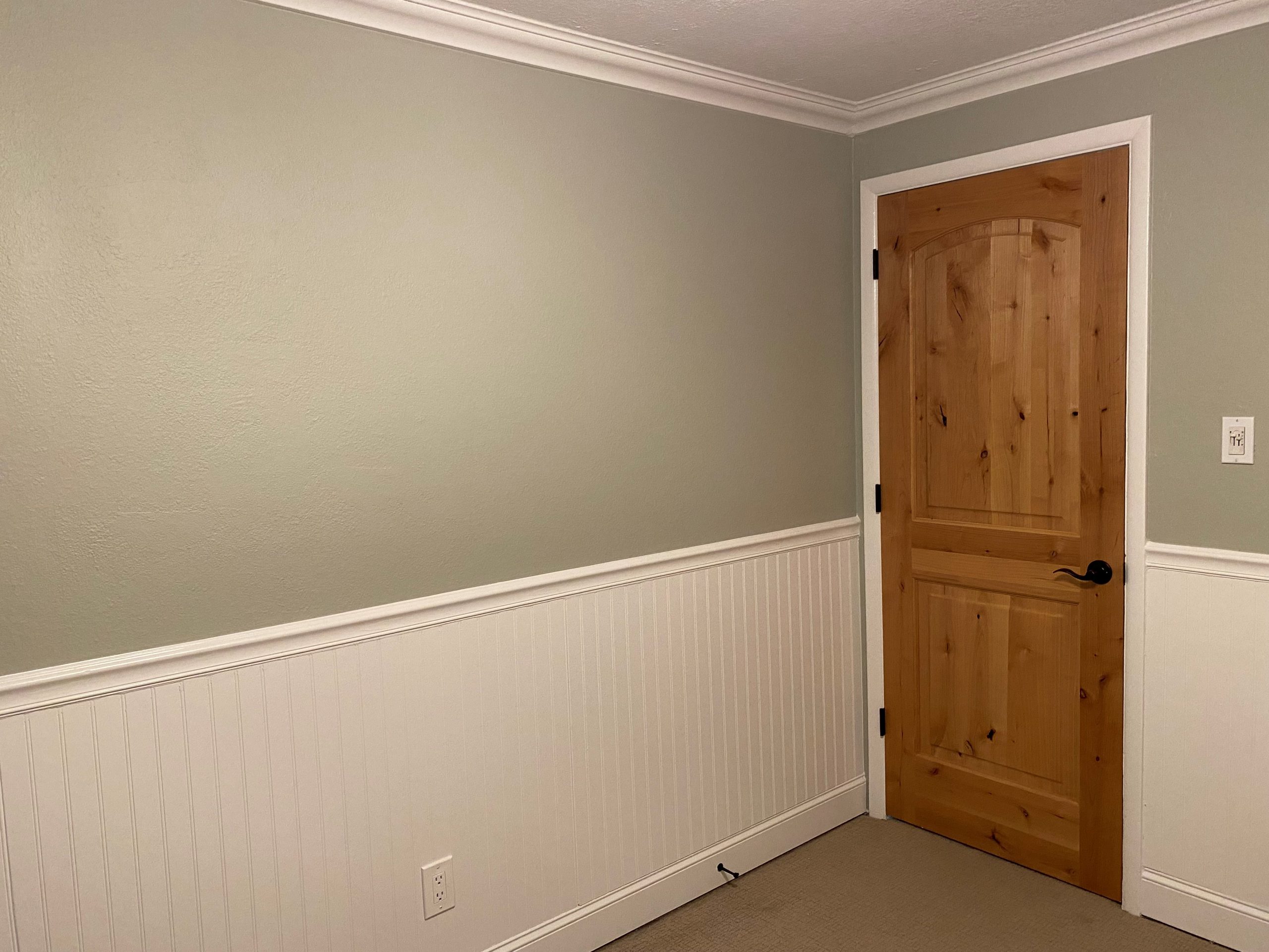 This room sports a real designer look with minimal effort. The wainscotting, trim, and crown molding provide a light paint color that plays off the darker wall color. To take it up yet another notch the interior door is a sanded and clear coated Alderwood that shows off its natural woodgrain finish and door paneling details.