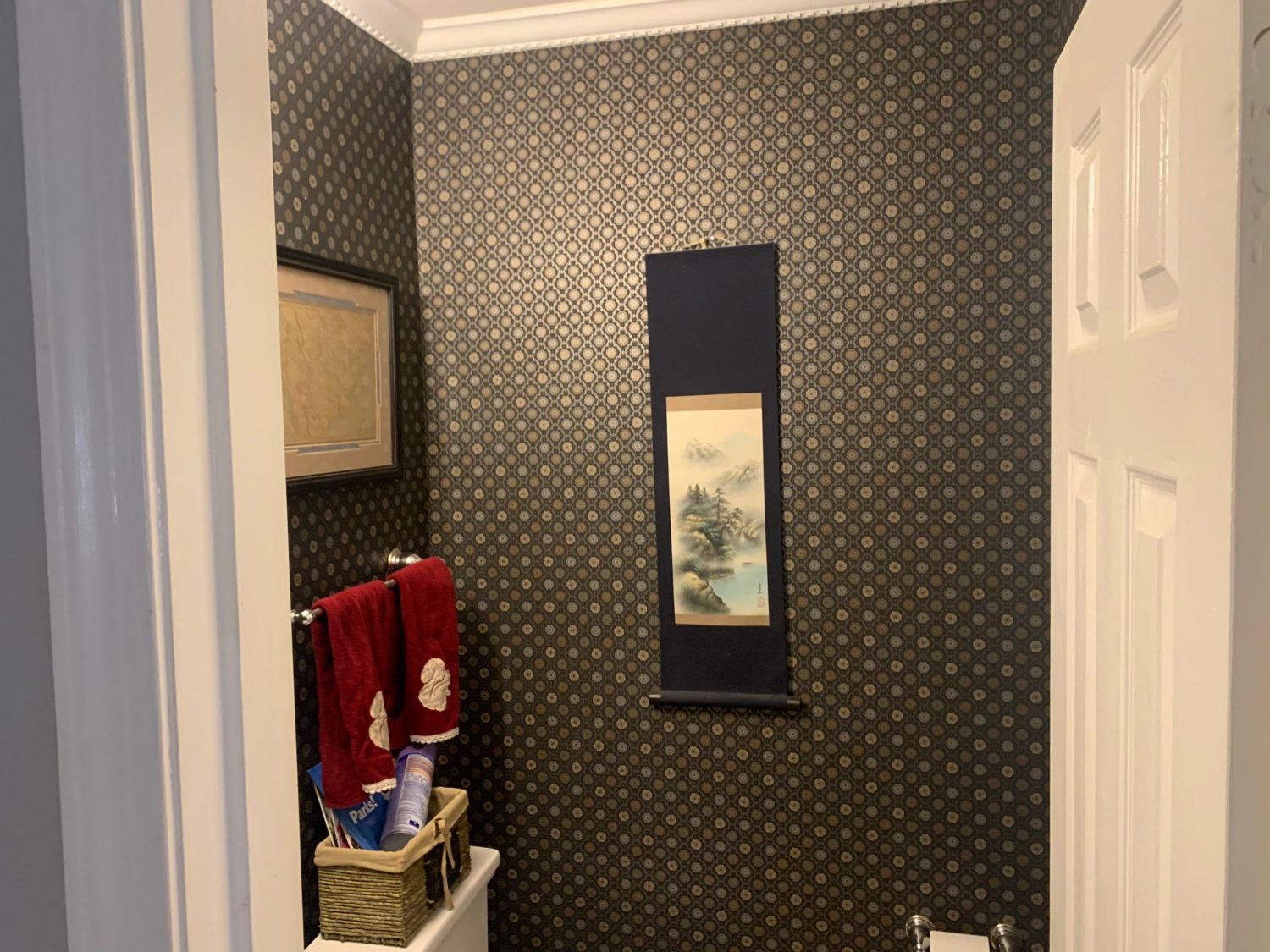 - Wallpaper removal in the half bathroom
