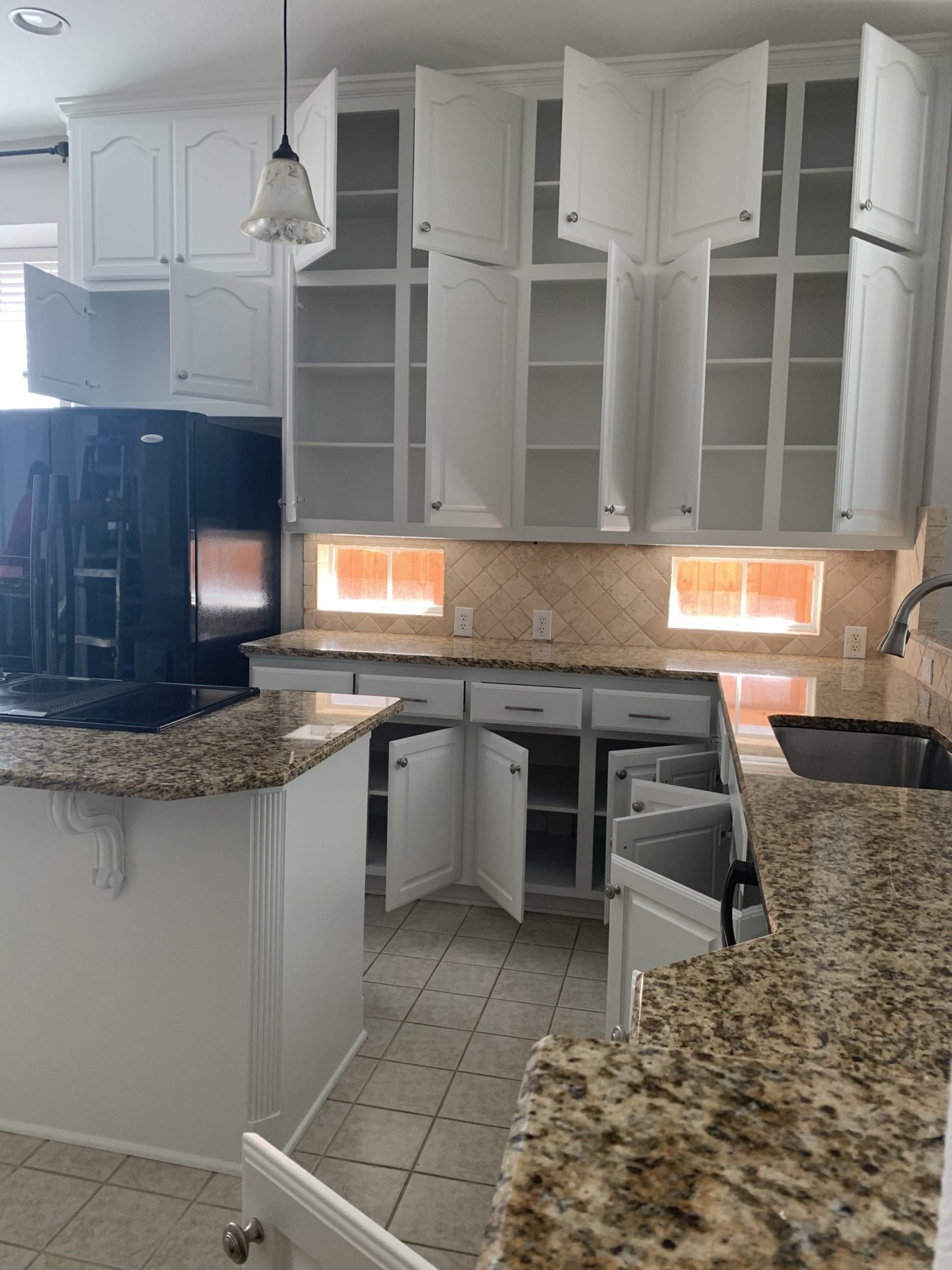 We couldn’t be more proud of the results from this kitchen cabinet painting project. Our kitchen cabinet painters in Richardson had the pleasure of turning this kitchen around with a fresh coat of paint. They were thinking they wanted to buy new cabinets, but the price tag was way more than they wanted to pay, so they called in our professional painters. The free painting estimate came in much cheaper, so they were thrilled they were able to get a brand new looking kitchen for a third of what they would have paid for custom cabinets.
