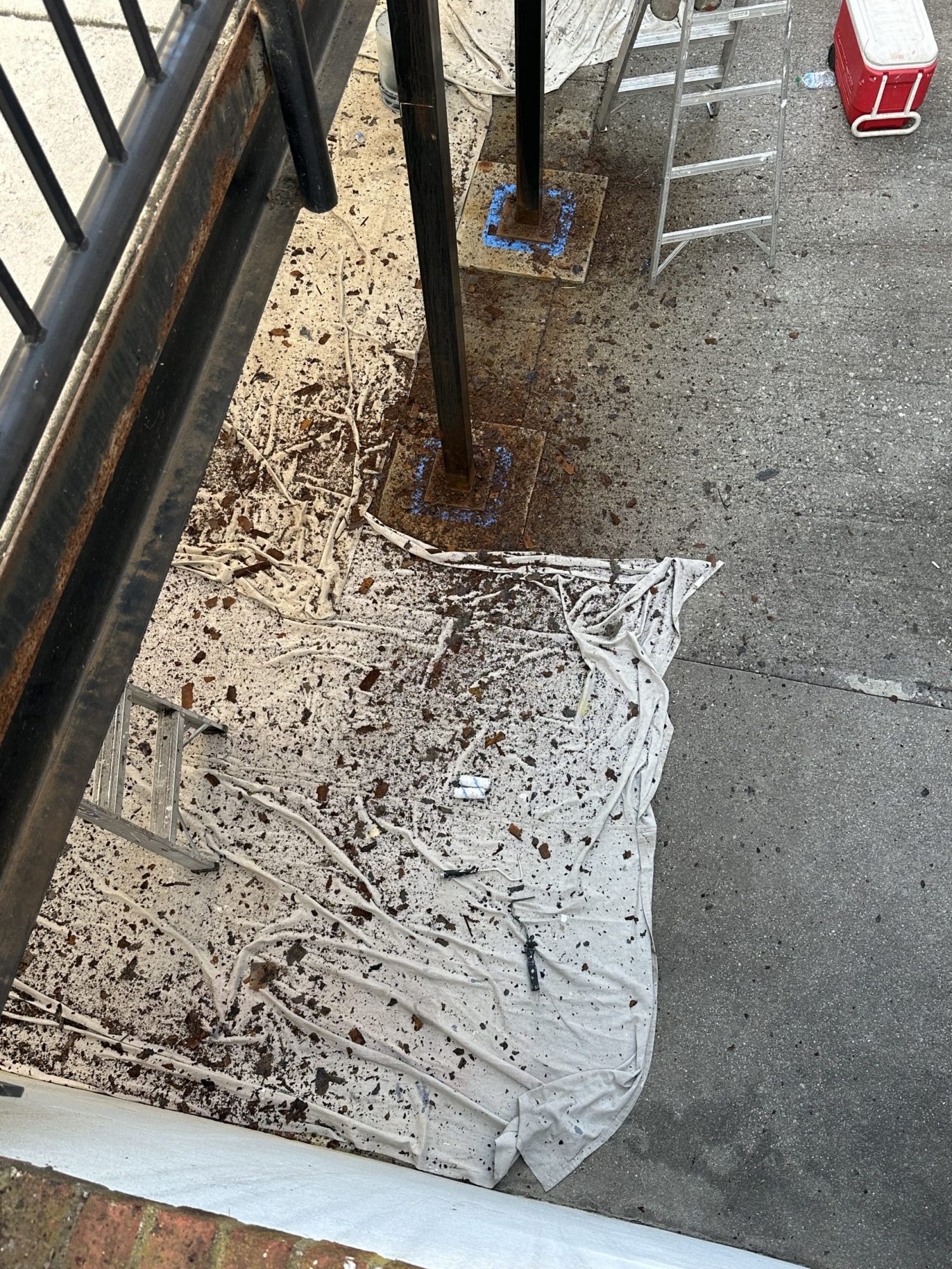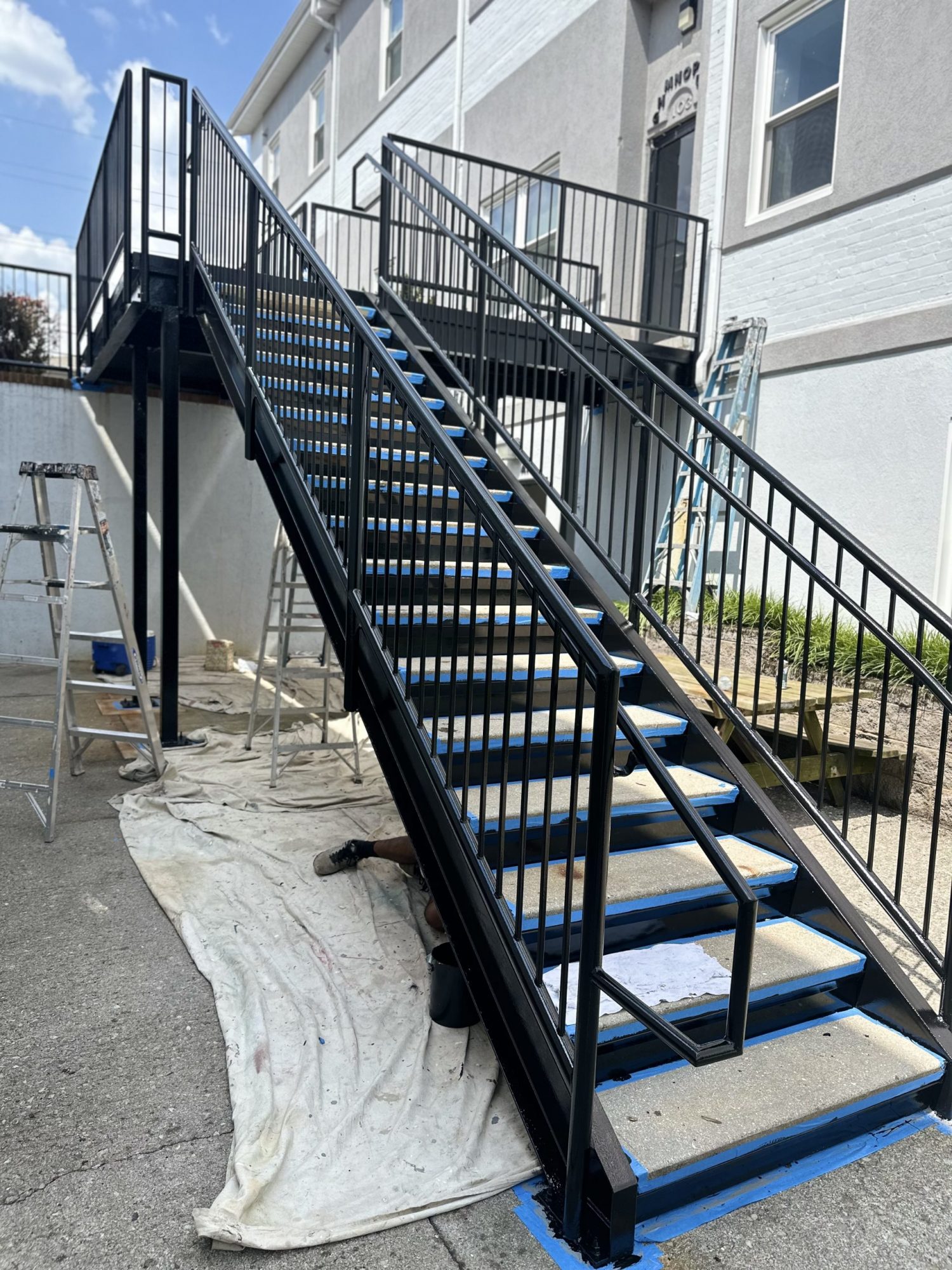 The crew spent one day scraping and cleaning all metal surfaces with wire bristle brushes, this step removed loose rust and prepared the surfaces for further treatment. We then pressure washed everything to remove remaining debris so that we can have a clean surface for primer application. Our painters applied a rust inhibitor primer that helps prevent future rusting and proper adhesion for the final coating, which required 48 hours to dry. Although the stairway required thorough treatment to ensure effective repair, our team continued to work on the project without hesitation. We returned 2 days later and top coated everything with industrial enamel.