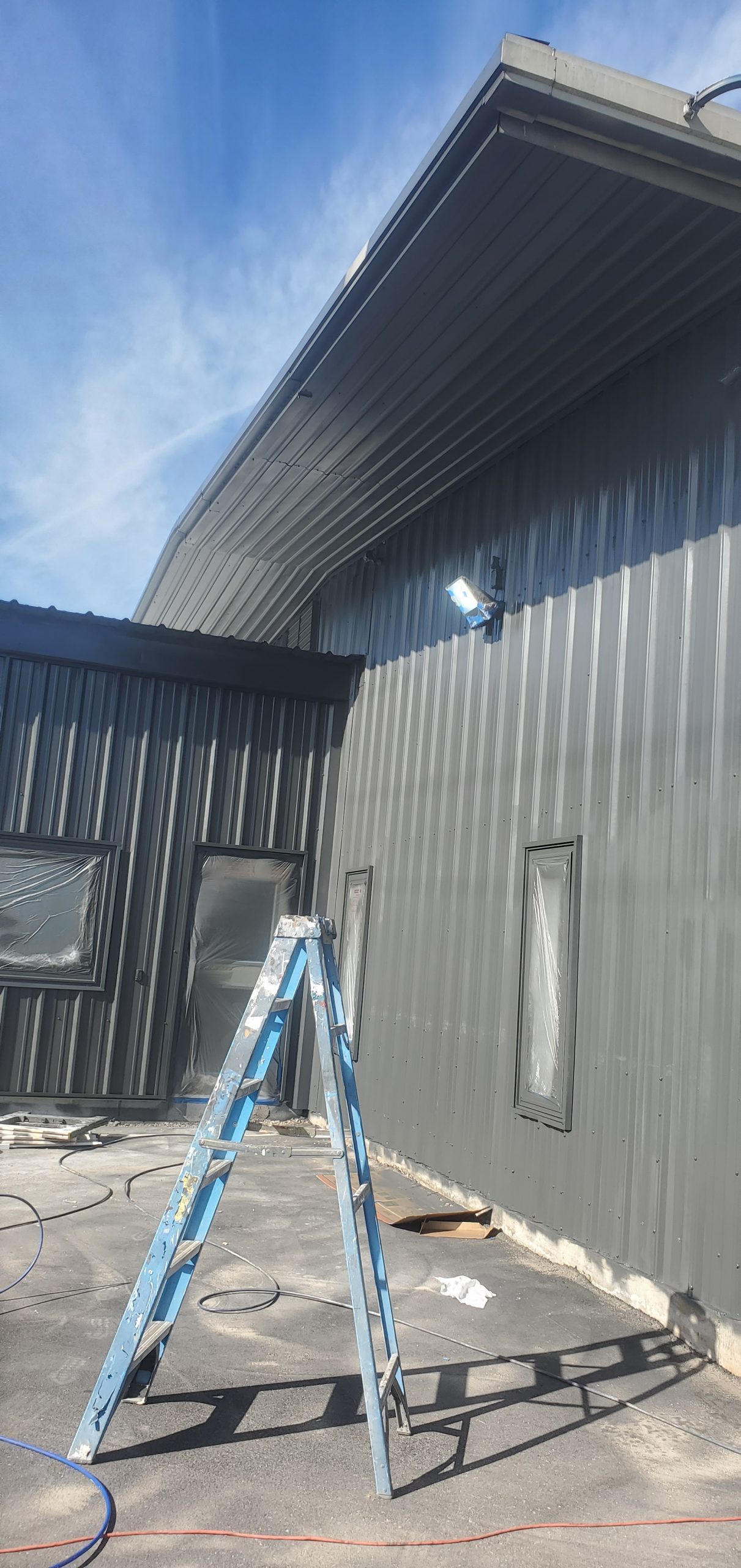 Our team began by thoroughly washing and cleaning the surfaces to be painted. We then scraped off loose and peeling paint, spot-primed exposed wood and metal, and recaulked areas where the previous caulking had failed. We painted the siding, soffit, fascia, front overhang, gutters, downspouts, windows, window frames, doors, and door frames using direct-to-metal paint. The bay door frames were also painted. As all the painting was done with sprayers, the crew took special care during preparation to avoid any overspray on areas the customer wished to keep paint-free.