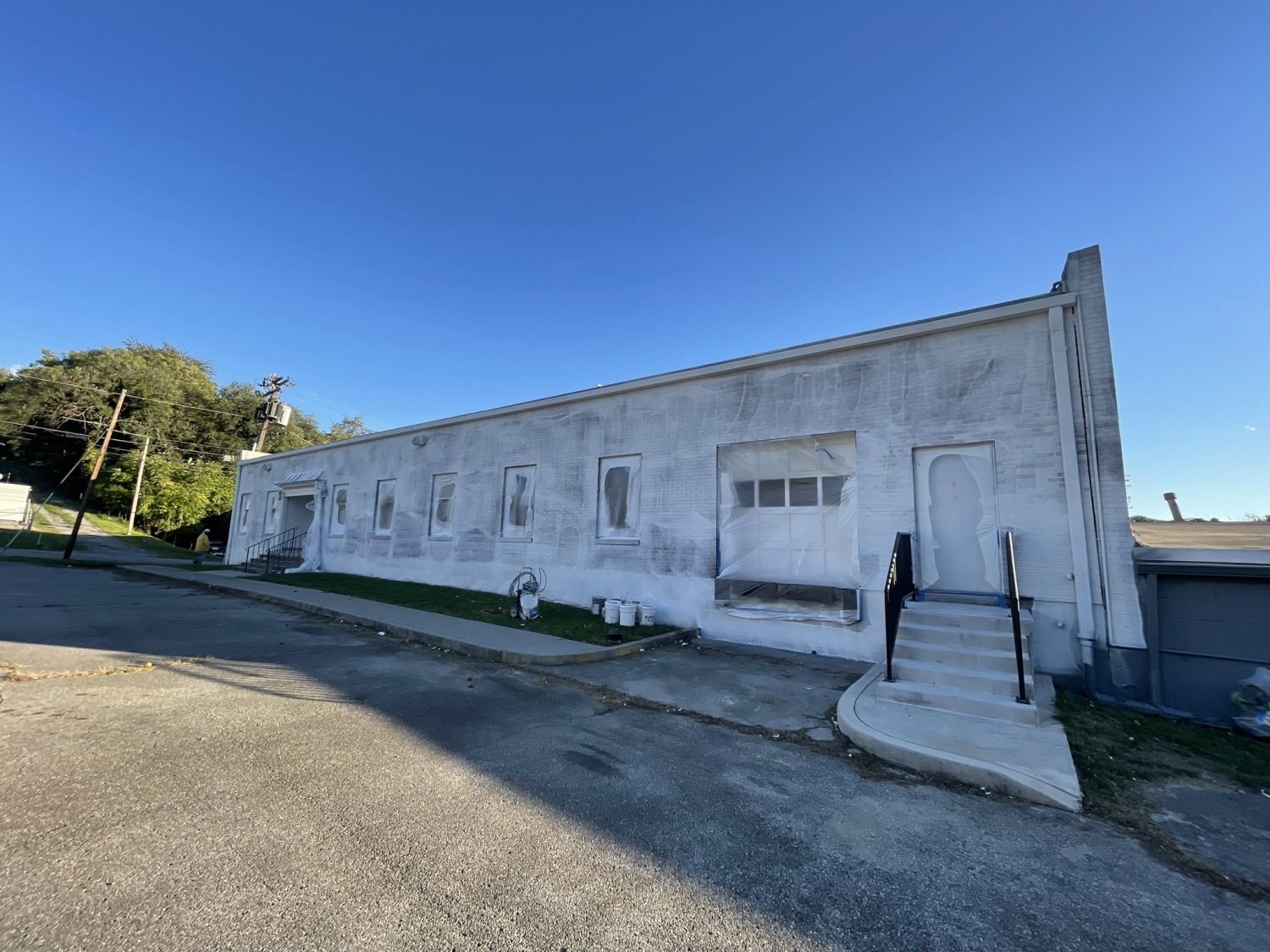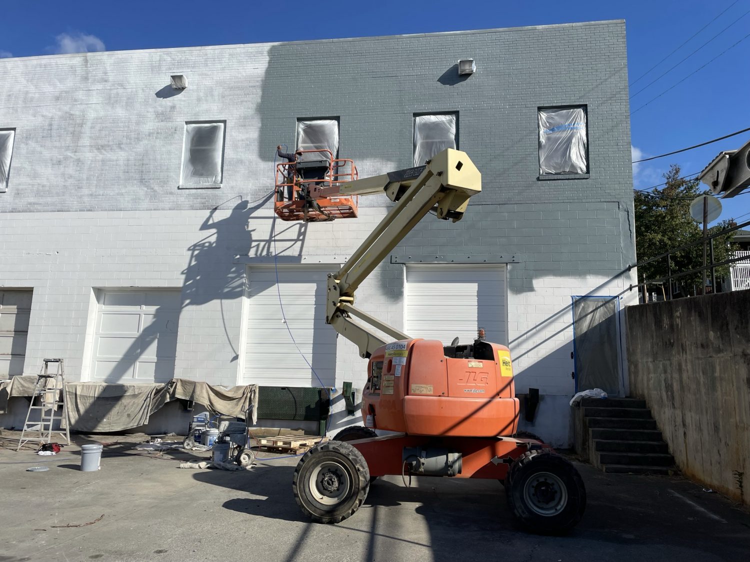 One of the unique challenges for our team was working with limited access to water. We had to manually deliver water in order to pressure wash the surface during the prep phase. There was also extensive overgrowth, including vines that were tangled into the windows themselves, that required landscaping work prior to the start of the project. Additionally, we rented a manlift for a portion of the project to reach some of the higher elevated surfaces.