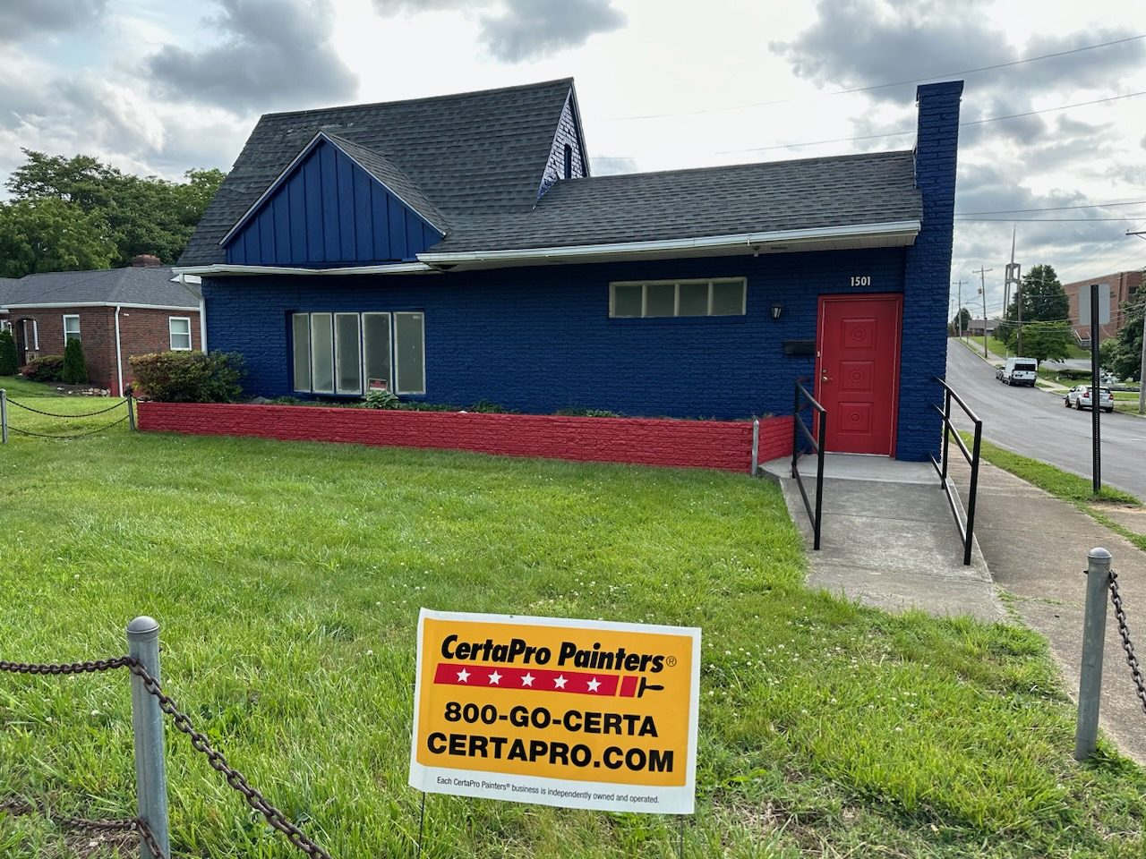 In May 2022, the professional painters at CertaPro Painters of Roanoke, VA were hired to paint the exterior of a brick office building. The building was worn and faded with minor peeling, and rust on the metal handrails.