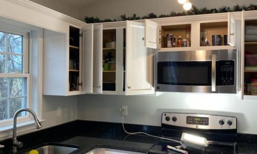 We sanded the cabinet doors & drawers off-site, however, the bodies of the cabinets were done in the client’s home. We used our Fes-tool dustless sander, to eliminate any dust particles from falling into the paint, as well as to prevent creating a mess in the Customer’s Home.