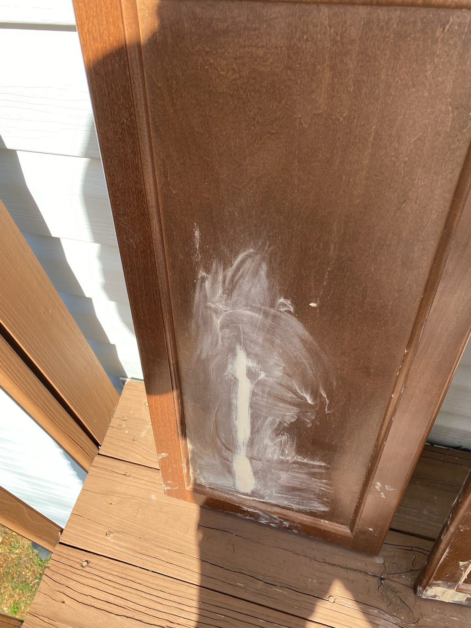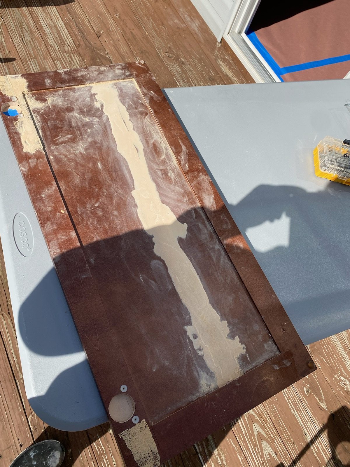 Two of the Cabinet doors required extensive repairs, as each had a significant crack, on both sides of the panels. We used a wood filler, applying 2 coats. Then we sanded the doors smooth, primed, and painted. The Client was very impressed with how the repairs could not be seen at all, once we were finished.