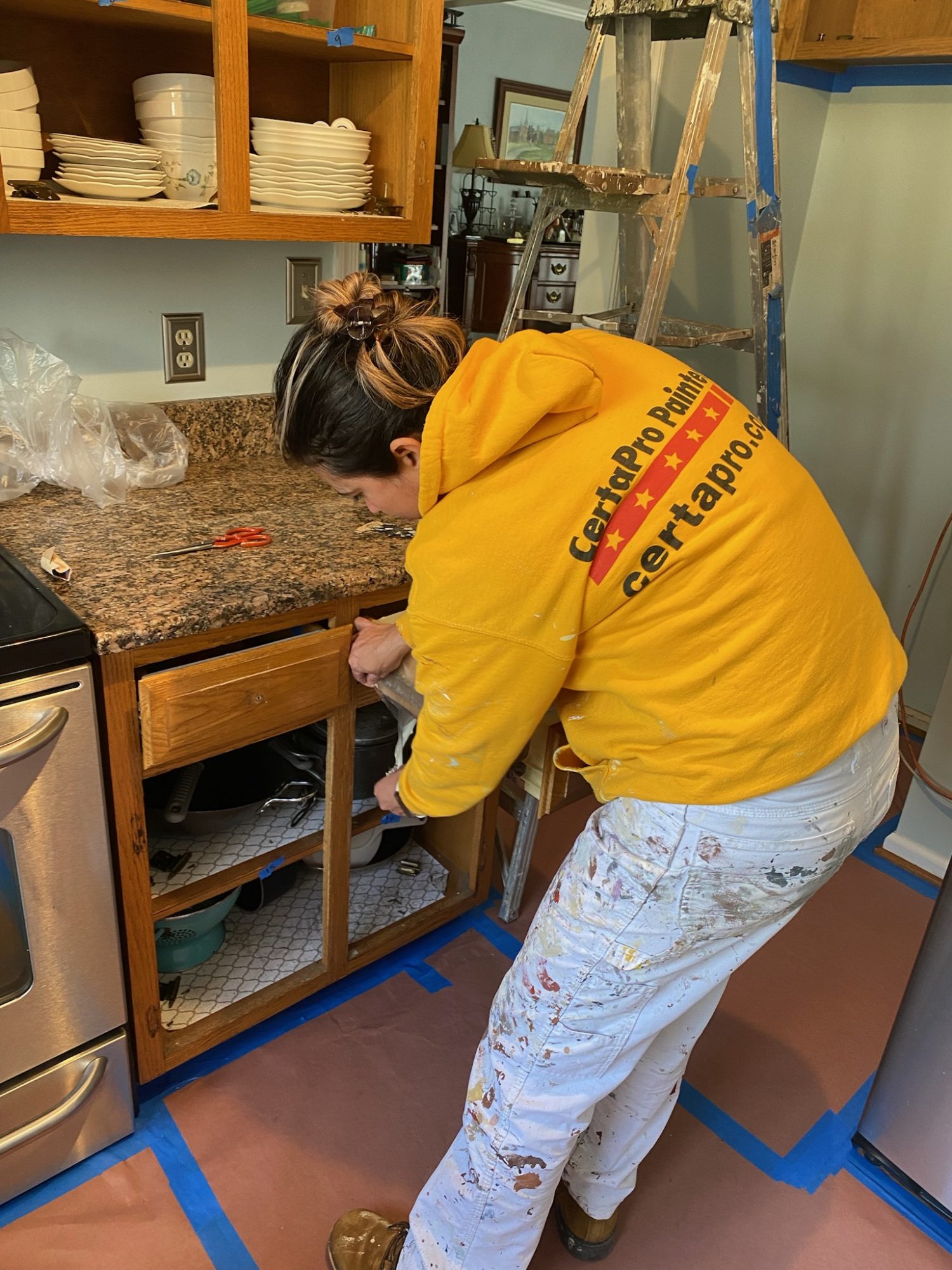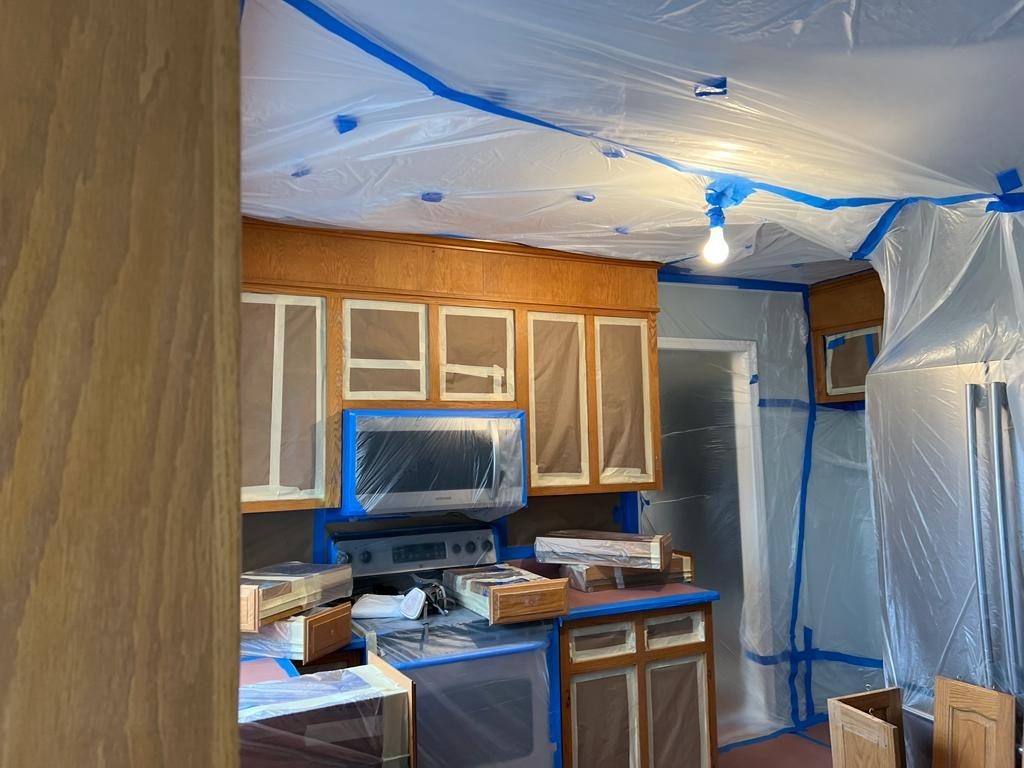 We began by removing all of the doors and drawers from the kitchen cabinets. We then scuff-sanded the surfaces to prepare them for painting. Next, we applied a primer to ensure the new paint would adhere properly, and finally, we top-coated the cabinets using Emerald Acrylic Urethane.