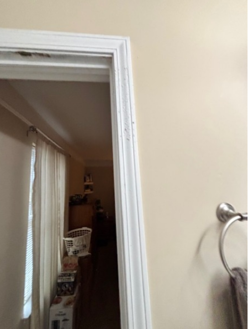 Our team began by thoroughly preparing the surfaces, which included scraping and removing any loose or peeling paint, replacing deteriorated caulk, and filling nail holes where hardware had been removed. We also addressed nail pops along the ceiling seam between the dining room and living room to ensure a smooth, seamless finish.