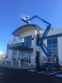 We used a 65′ articulated boom lift in order to access the large overhead entrance canopy. Our team of commercial painters used additional lifts to increase production speed. They used multiple masking efforts in order to articulate the color banding. Full masking of the multi-storied window sets.