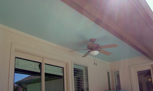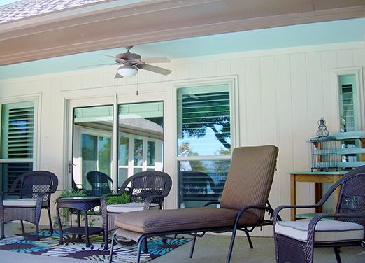 A beautiful home exterior project in Rockwall, TX, that allowed the colors and paint (amongst the trim, walls, and wood deck) to bring this patio to life.