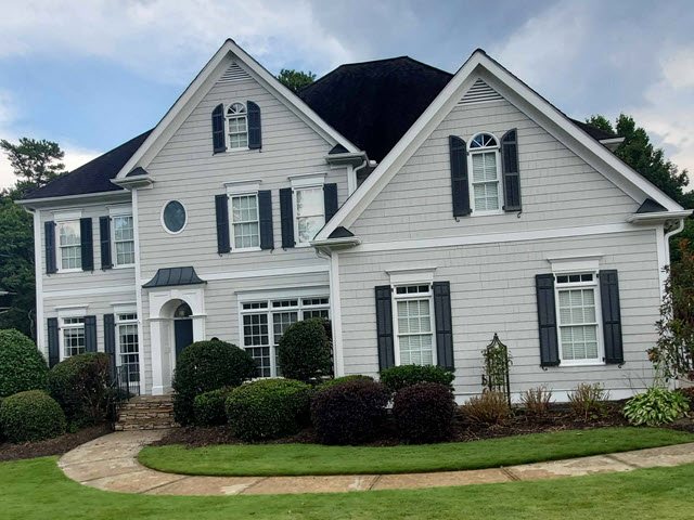 The trim was painted with a color matchThe siding was painted with SW 7015, Repose GrayThe shutters and metal roofs were painted with SW 7069, Iron Ore