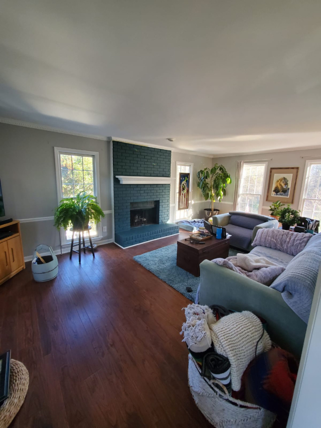 The mantle was painted with SW 6223 Stillwater. The walls were painted with SW 0055 Light French Gray.