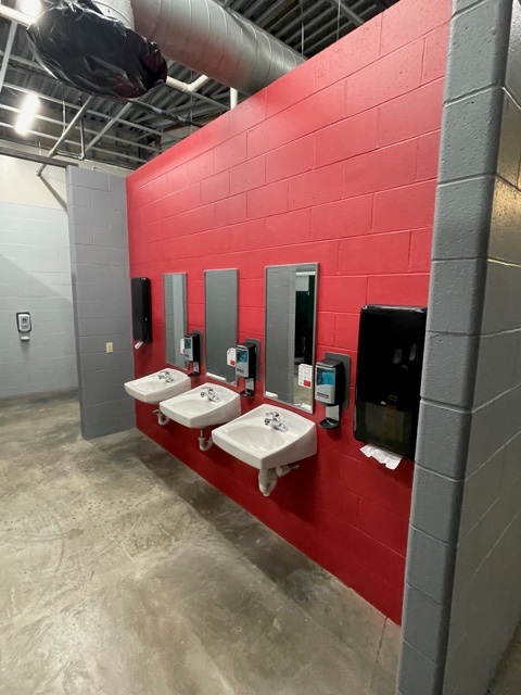Picture of an interior project we did at the St. Charles Family Arena. We repainted a number of their bathrooms, and transitioned to a new bolder updated color scheme.