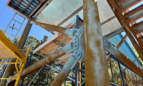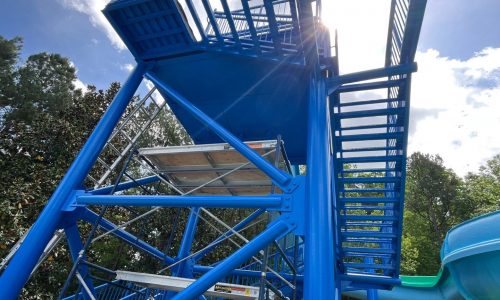 This project presented several unique challenges in the areas of accessibility, timing sensitivity, and logistics. Certain sections of the slide required scaffolding due to height and terrain, with natural barriers ruling out the use of ladders or lifts. All prepared surfaces had to be painted the same day to avoid flash rusting. Additionally, the topcoat needed to be applied within three days of the primer. Products had to be special ordered with no room for error. The two-part coatings had a short working window, making precision in both ordering and application critical.