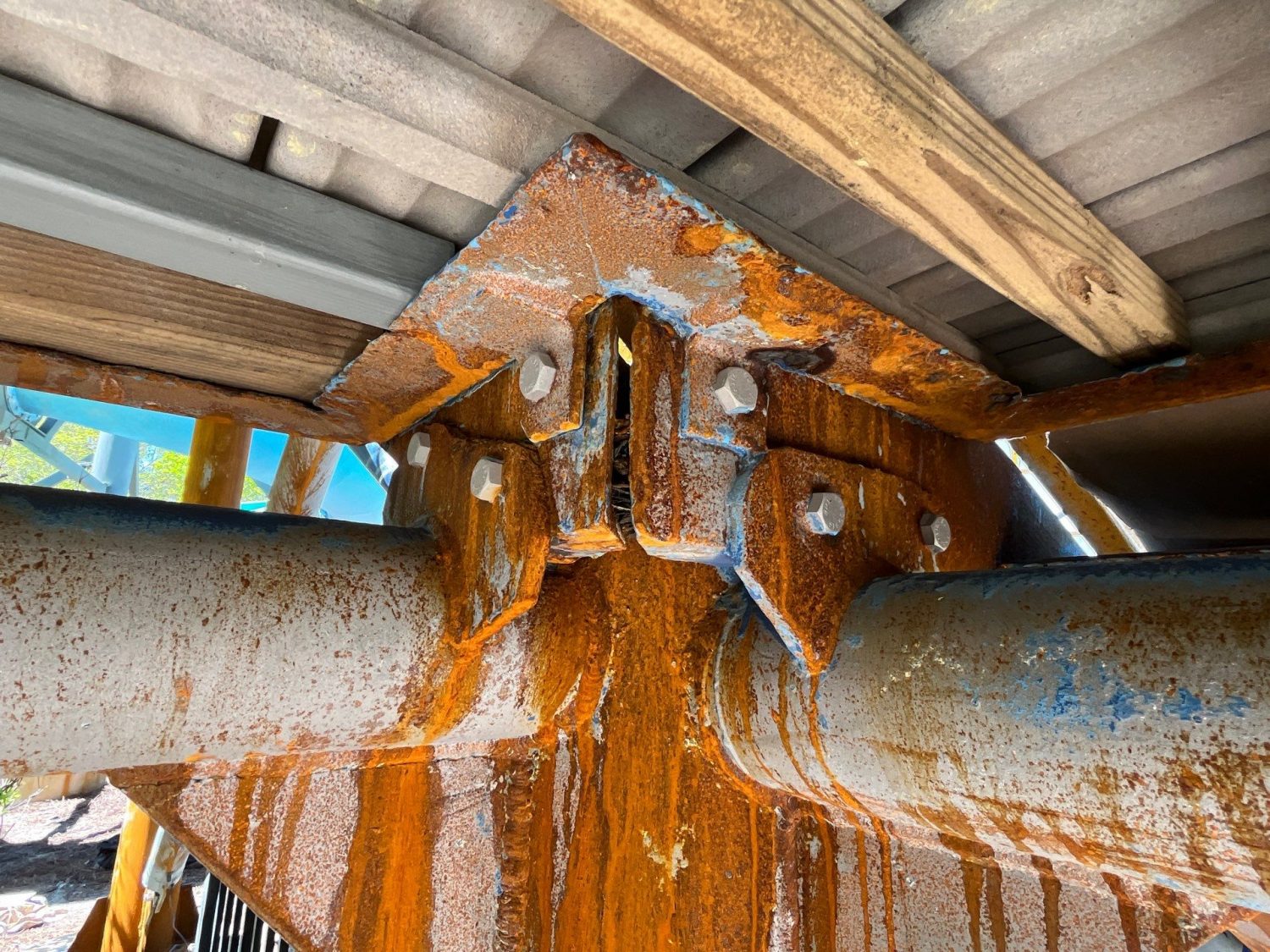 At the start of the project, the slide showed clear signs of neglect. Paint was failing, and despite an initial sandblast, heavy surface rust had developed due to delays in coating application. The corrosion was so extensive that in some areas, planks had to be removed and reinstalled to reach and treat the affected metal. The existing coating was worn down to a previous layer, and several cracks in the structure called for careful patchwork.
