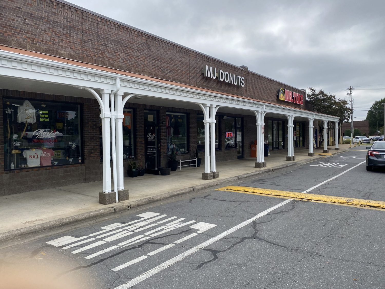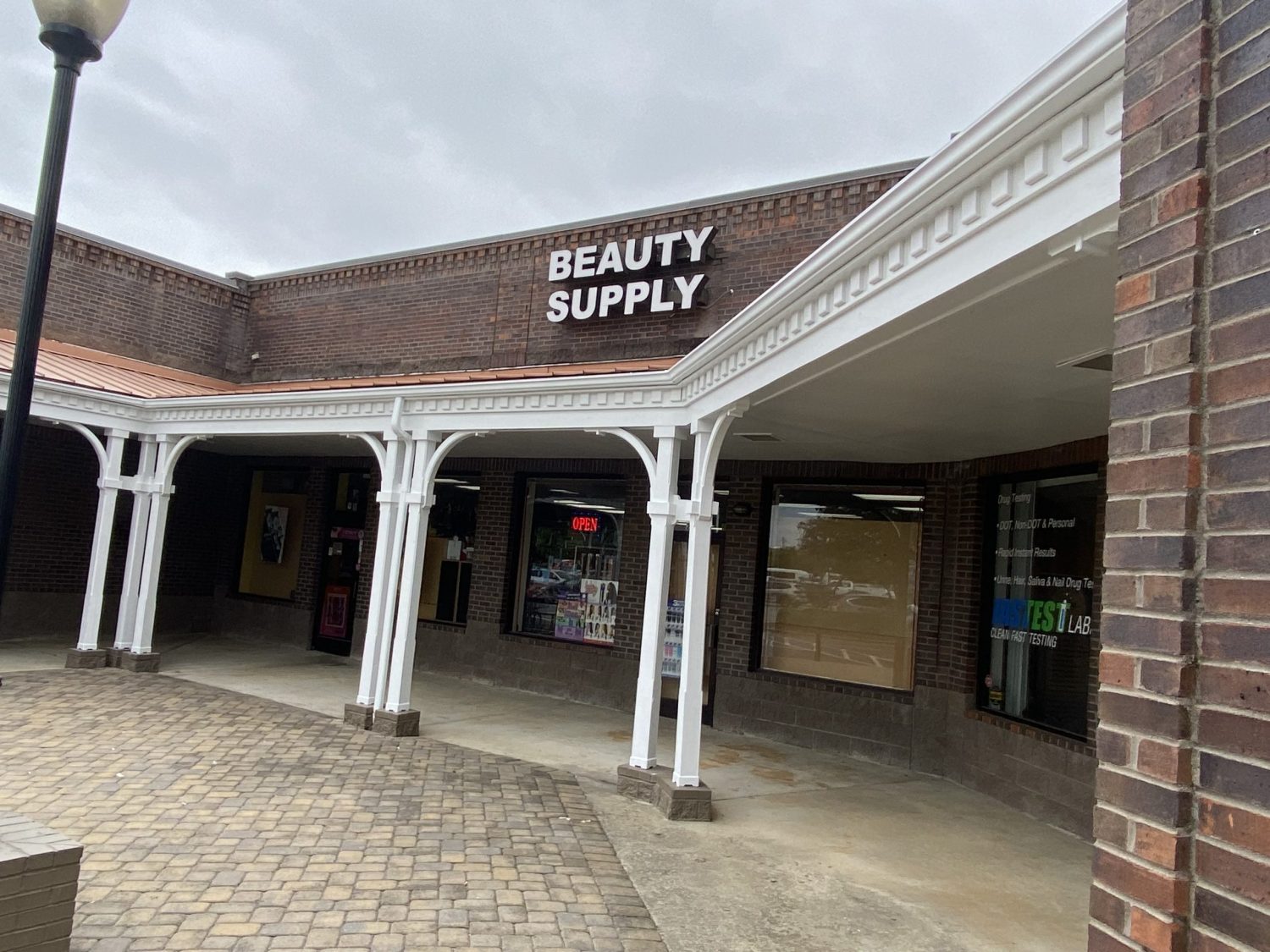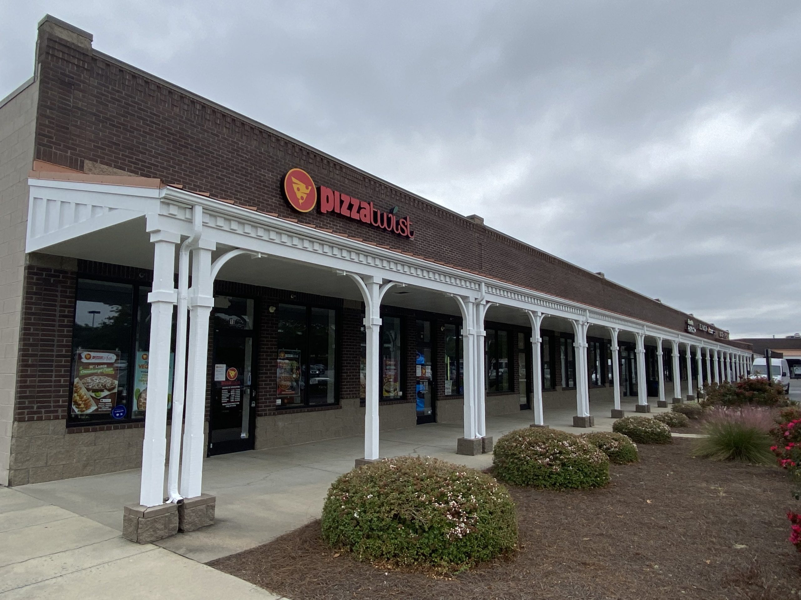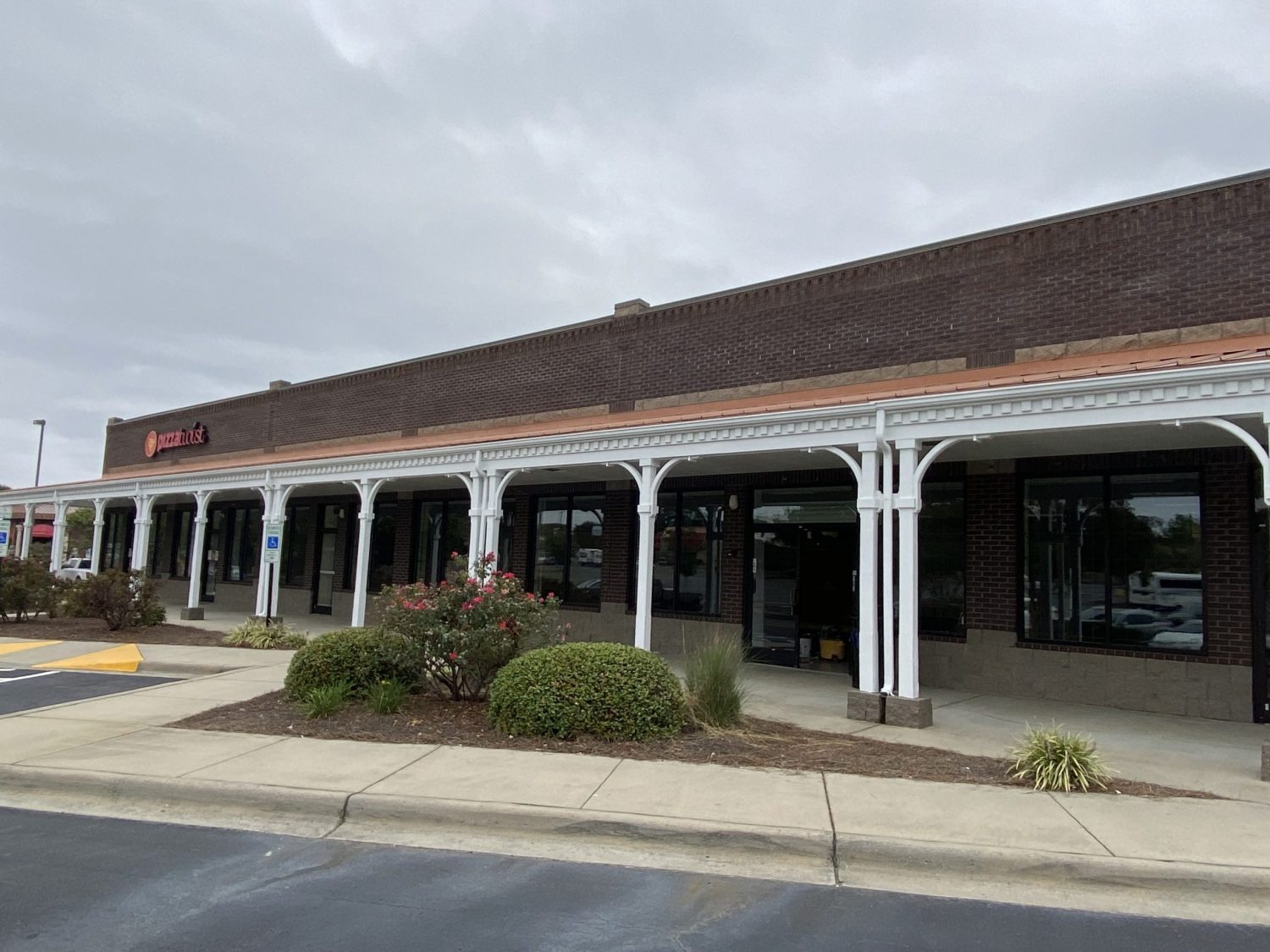 Our team had the opportunity to repaint the portico and columns of this extended sheltered hallway section of this retail shopping center in Pineville, NC.