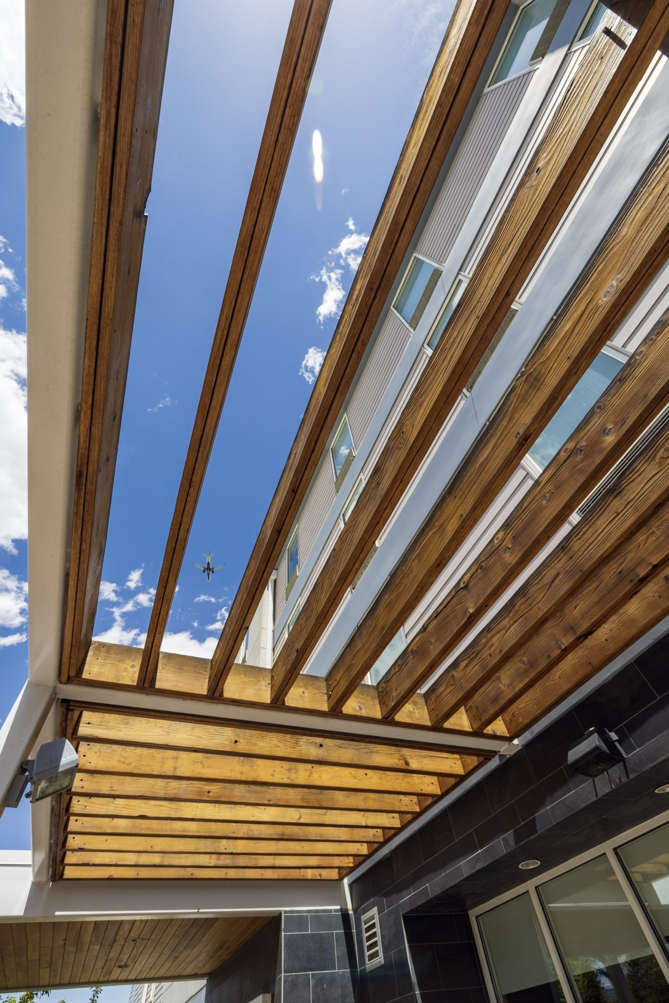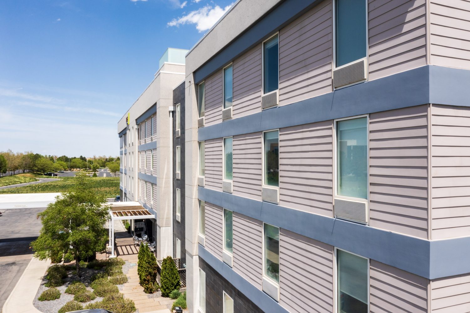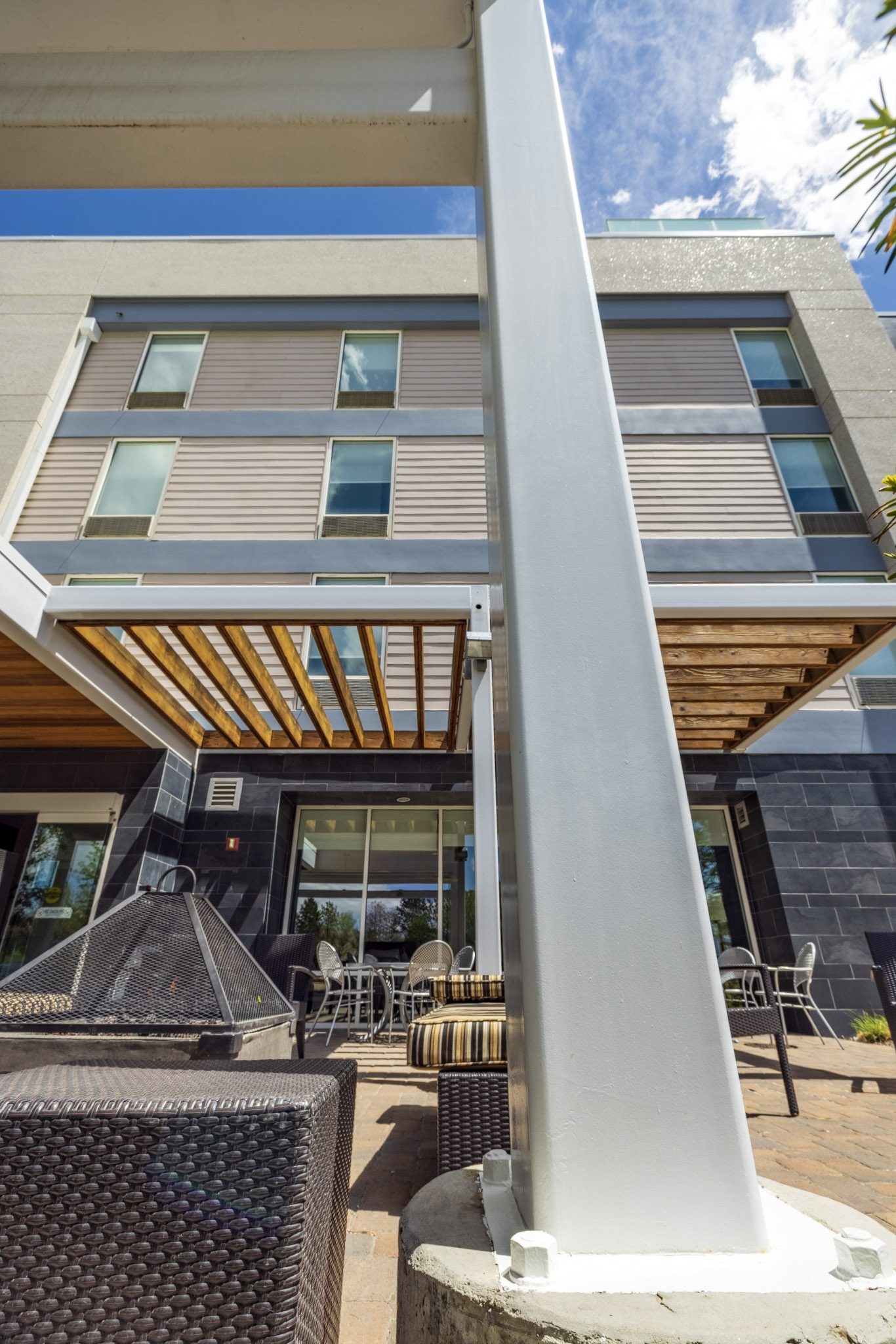 We painted the gray striped exterior areas and the wood awning over the front sitting area.