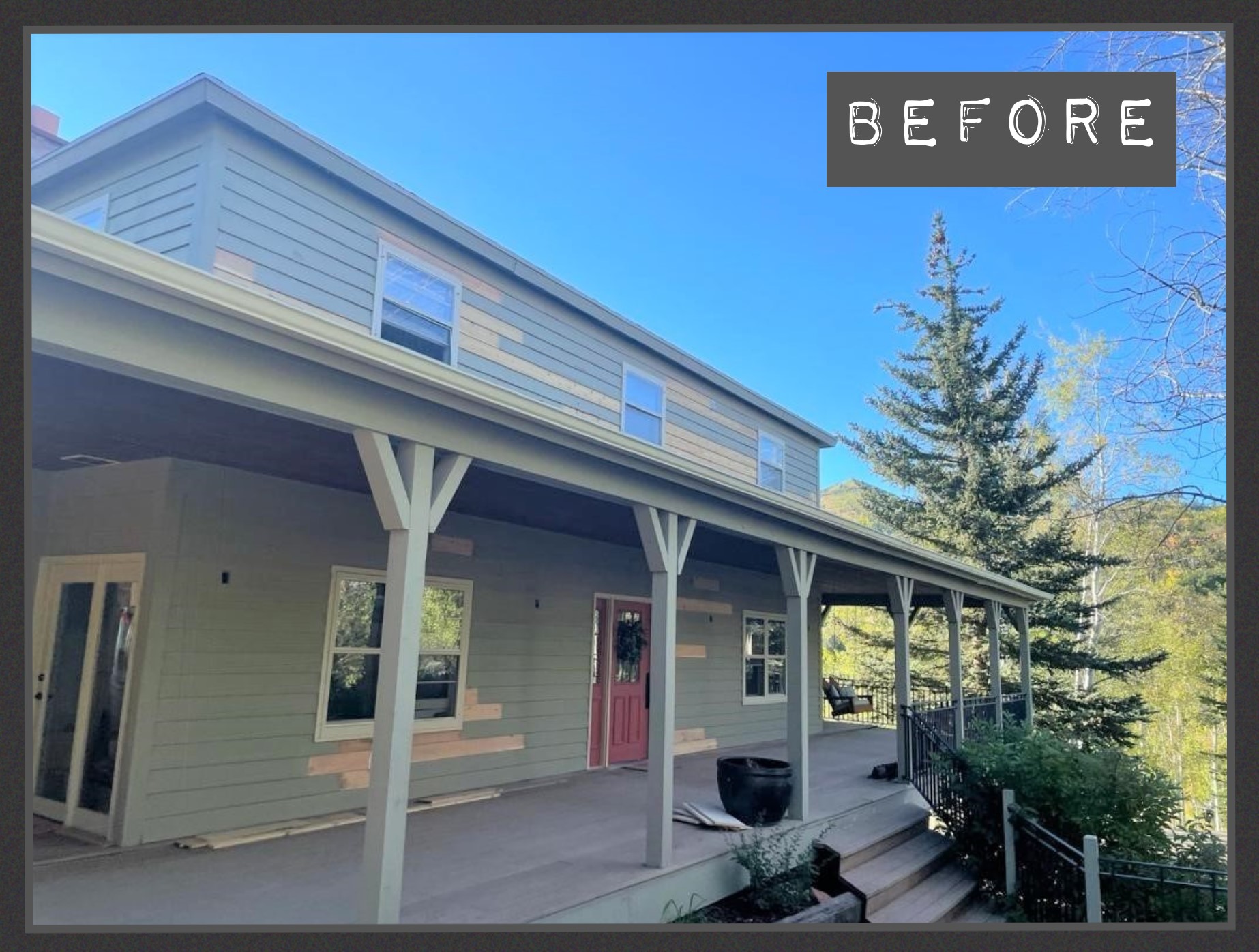 Eduardo and team painted the entire exterior, the man doors and frames, garage doors and frames, windows and window frames, and the porch support beams on both levels. The fascia was a different color from the main body of the home.