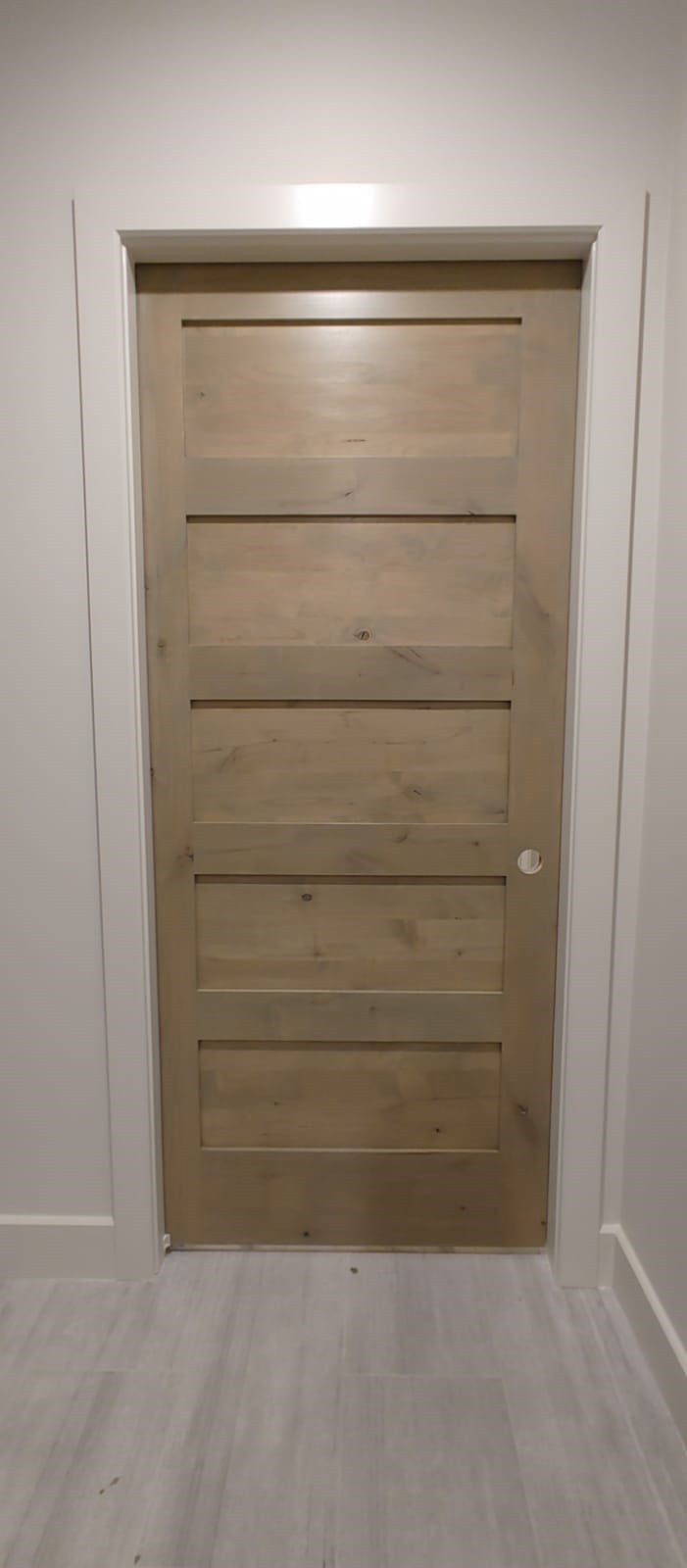 These interior doors were removed, sanded and then given a light, nearly transparent stain finish that adds a dash of natural color while still highlighting the wood grain finish.