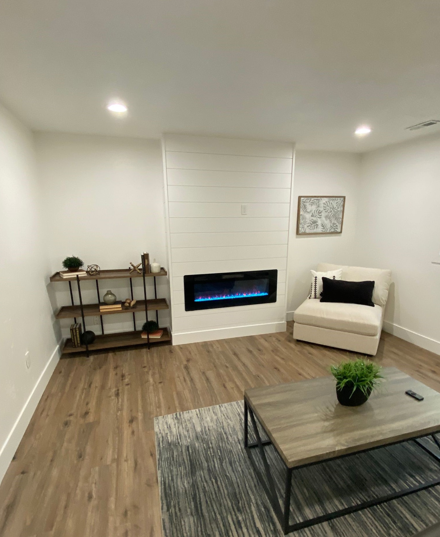 This Salt Lake City living room boasts a shiplap covered fireplace surround above a gas fireplace. The entire room, fireplace included, was repainted a modern and clean shade of alabaster white from Sherwin Williams.