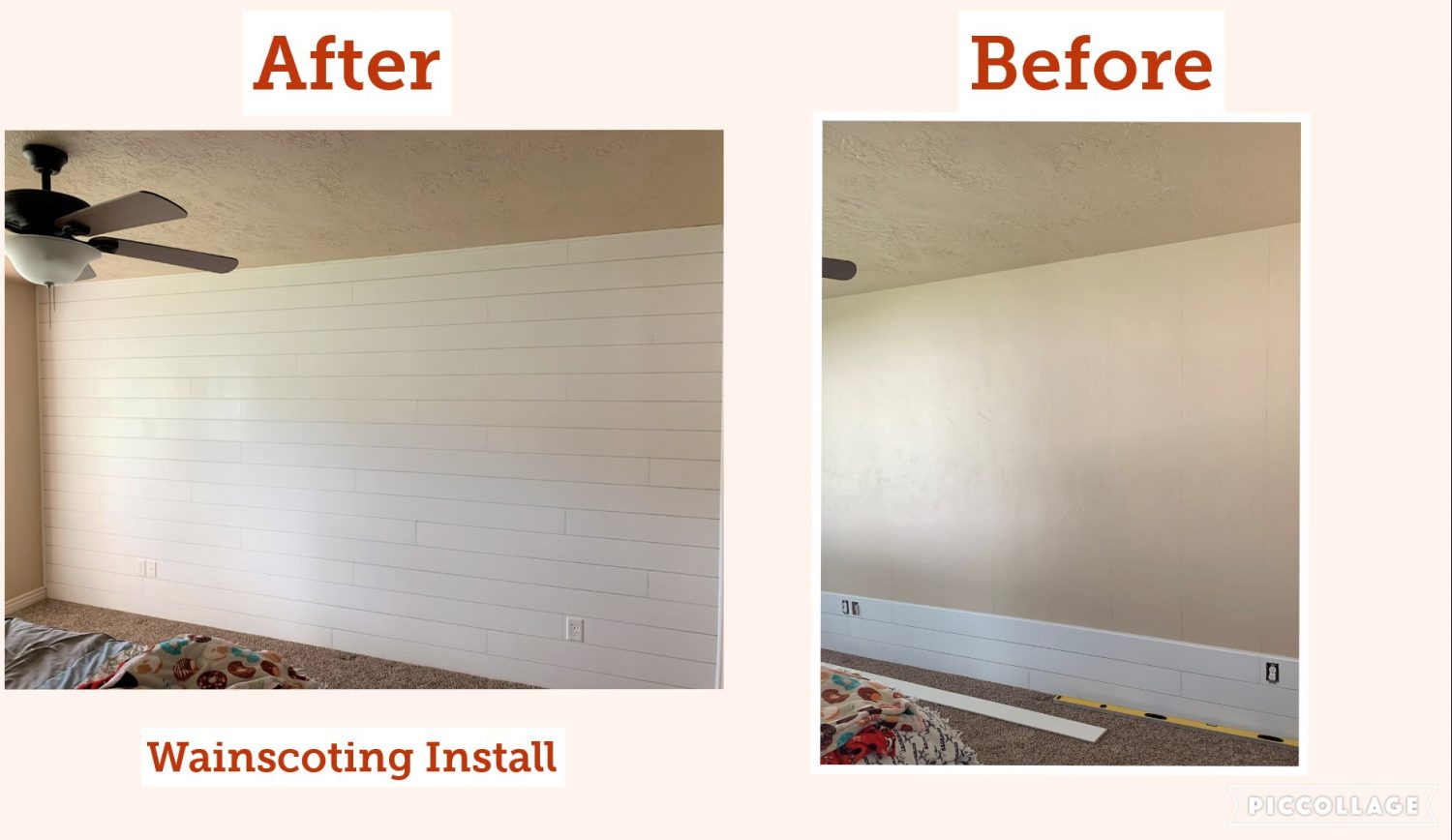 In June 2020, our handyman did 3 different areas of the home: 1) bead board around the kitchen counters/lower cabinets, 2) installed a focal wall of shiplap, and 3) installed a wainscoting detail around the basement common area.