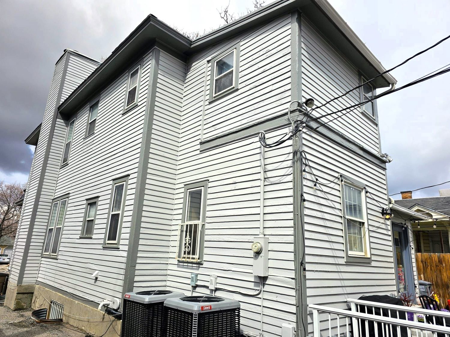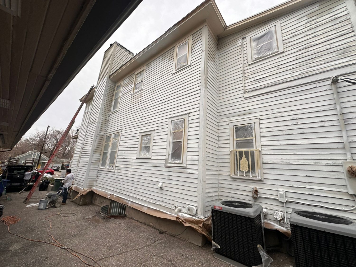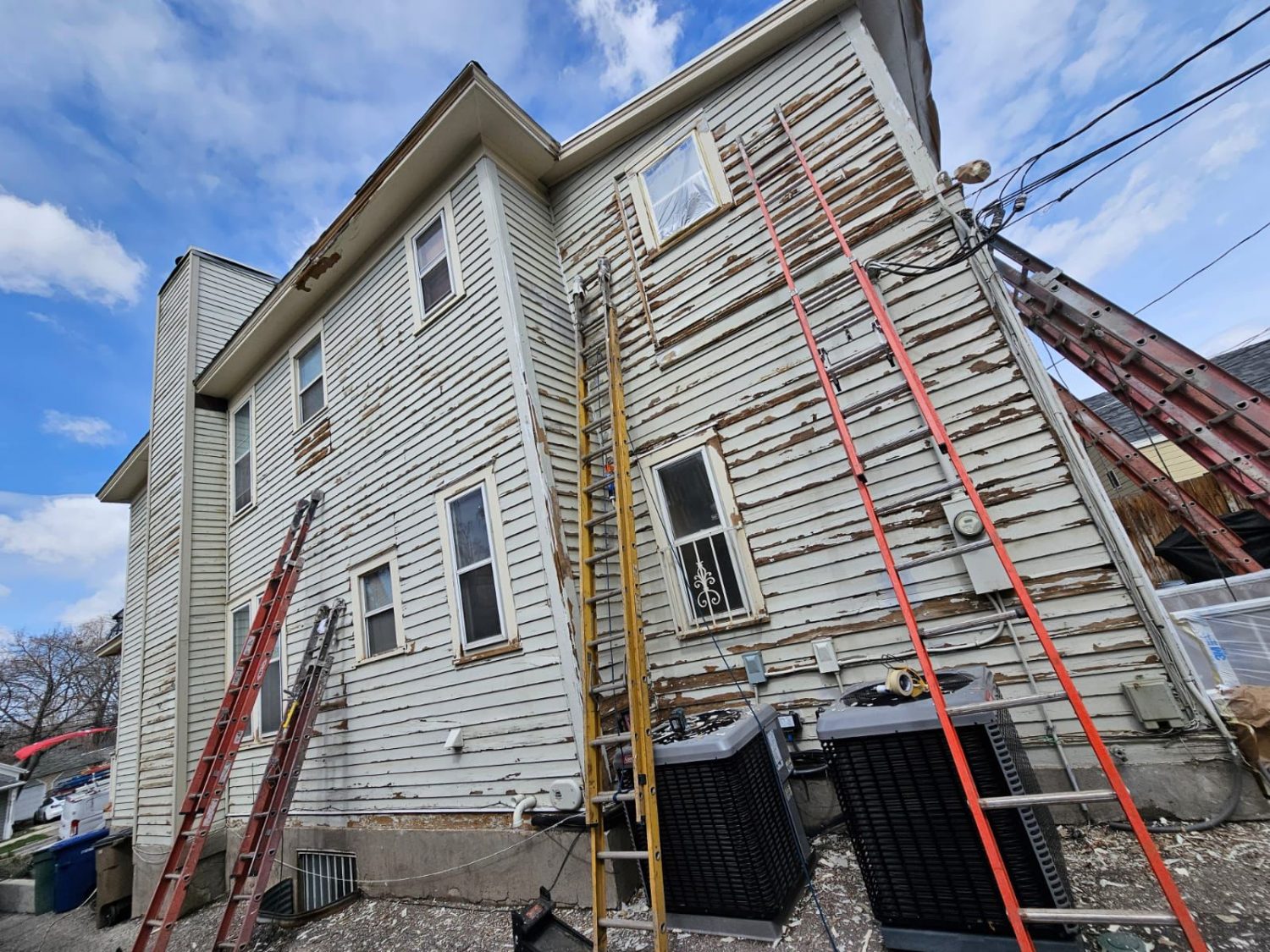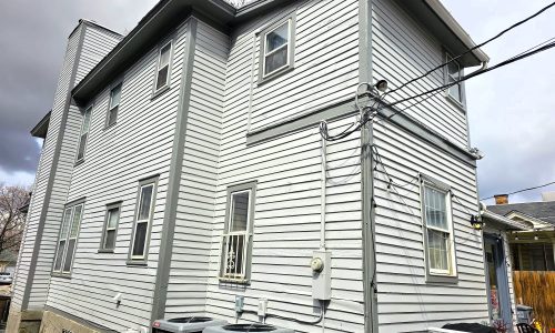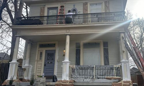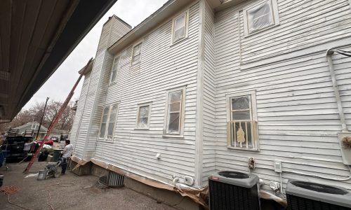 The age of the house necessitated a thorough power washing and meticulous hand scraping of the wood base to ready it for a fresh coat of paint. Some sections of the wood had to be repaired and replaced prior to the painting process.