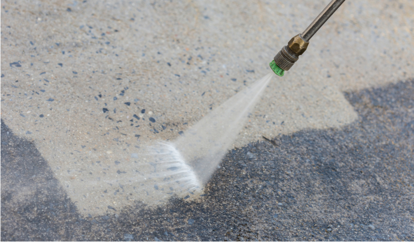 With a broom, or wet-dry vac, clean all of the debris, leaves and cobwebs from the floor. Use a degreaser to remove grease stains, and rinse the floor thoroughly. If you’re dealing with heavy stains, a pressure washer could be in order.