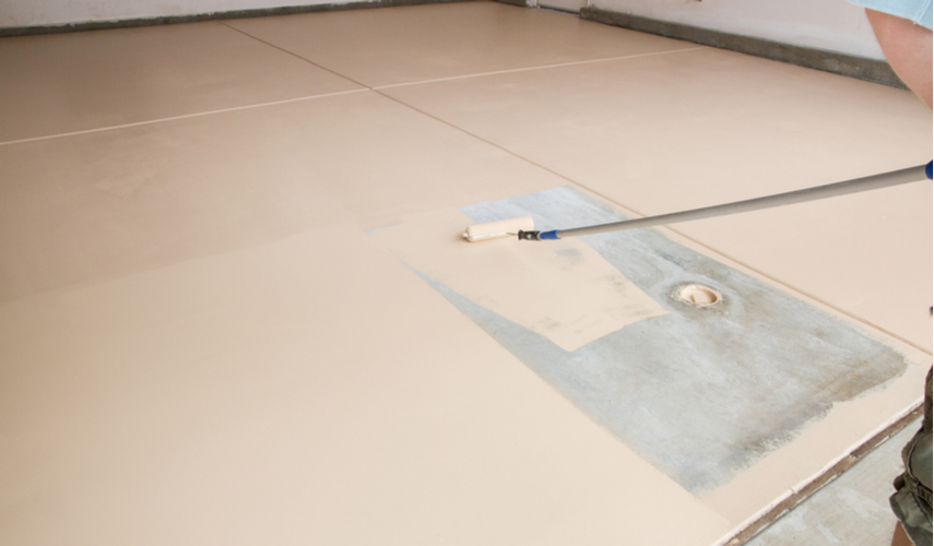 First, go over the concrete thoroughly. For most of us, that means we first need to clean and dry it. Make sure there are no major cracks or damages. Small cracks and divots can be corrected with a concrete patch before you begin painting. If your concrete often is wet or shows water is coming through, add a layer of concrete waterproofer before you begin painting.