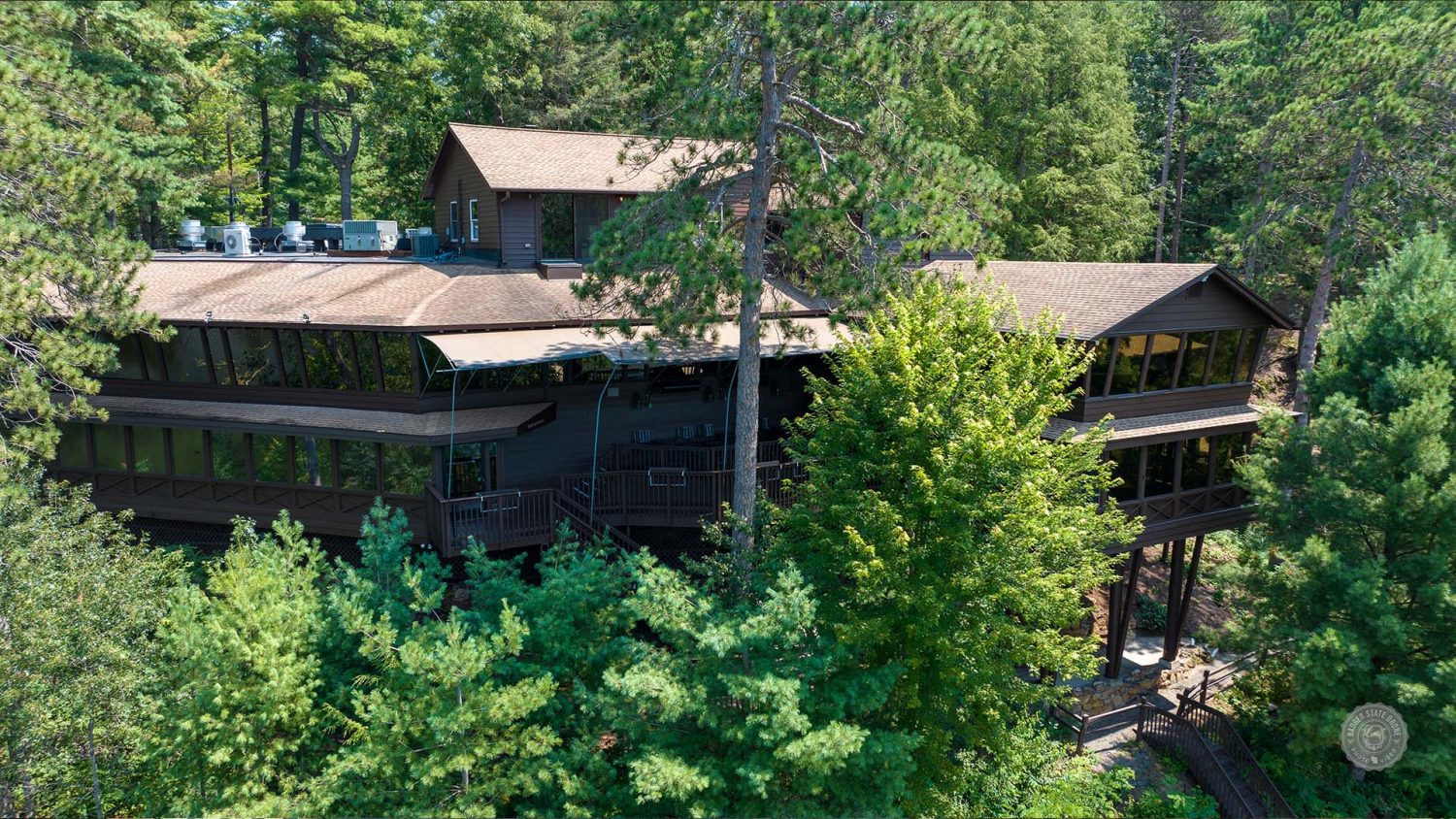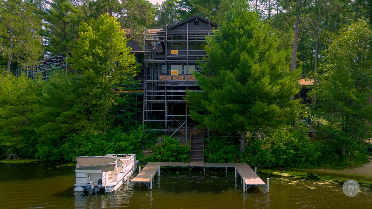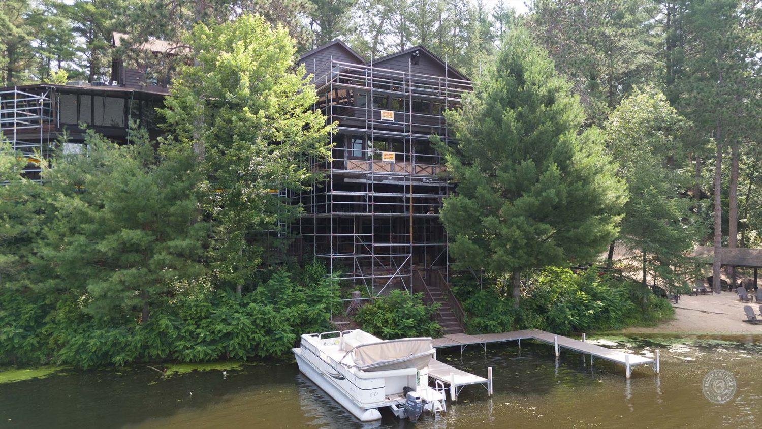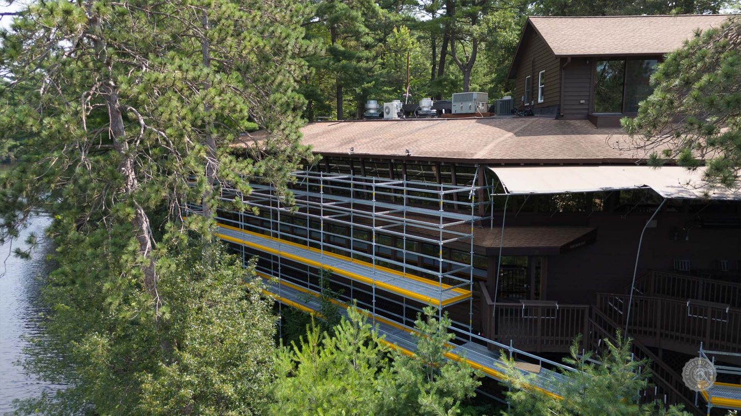 - Location: Ishanala is positioned on a cliff overlooking Lake Delton, making typical lifts and ladders ineffective. To combat this our team had to erect scaffolding around the exterior.