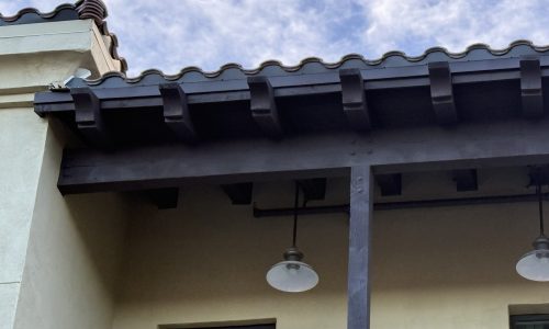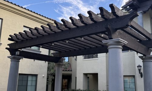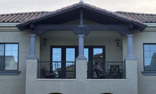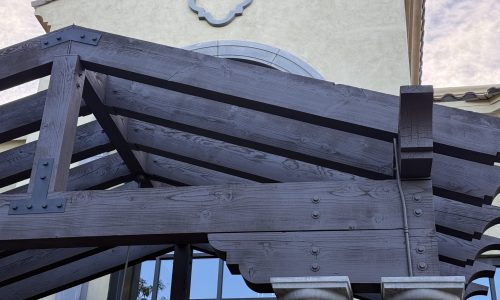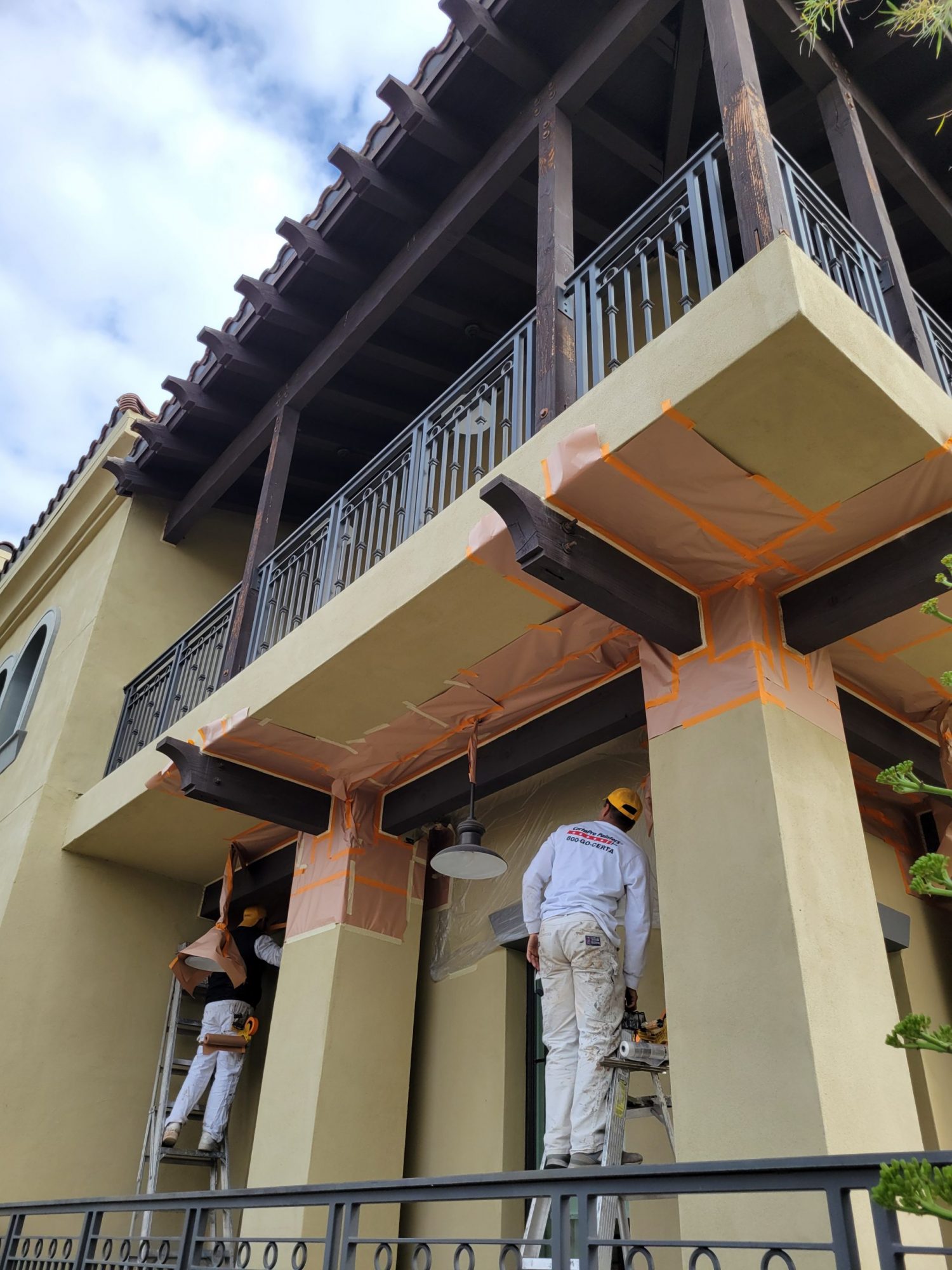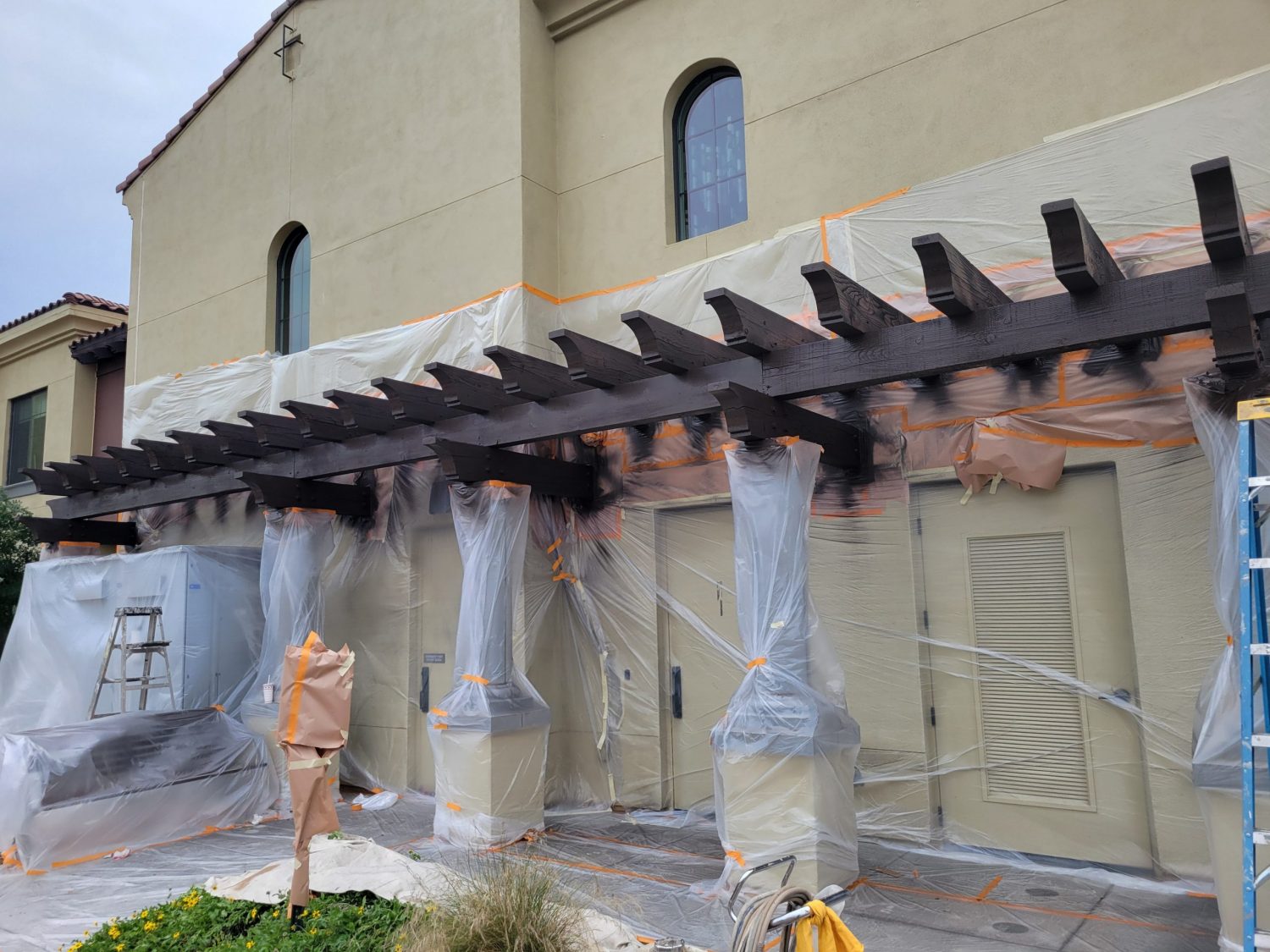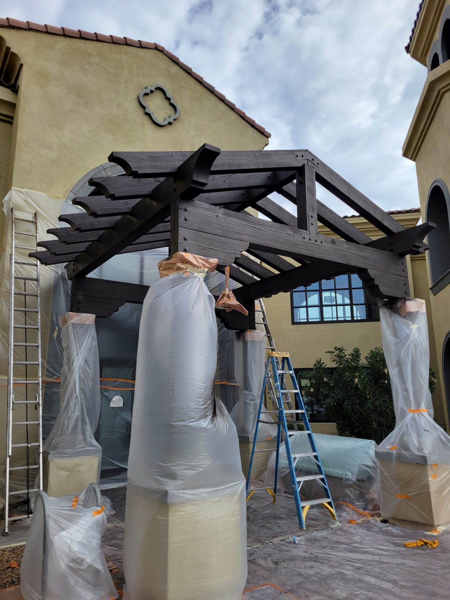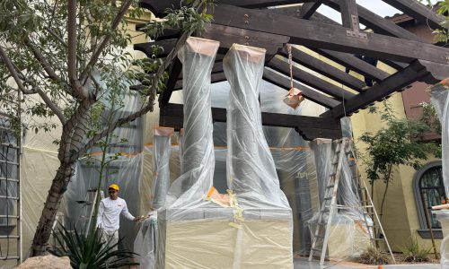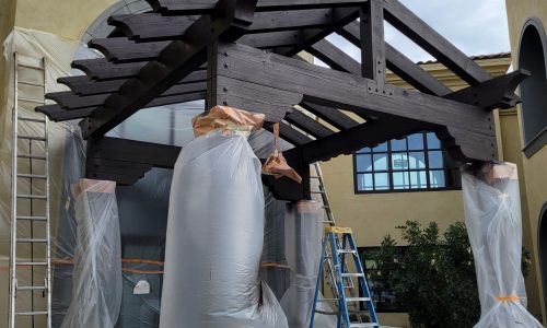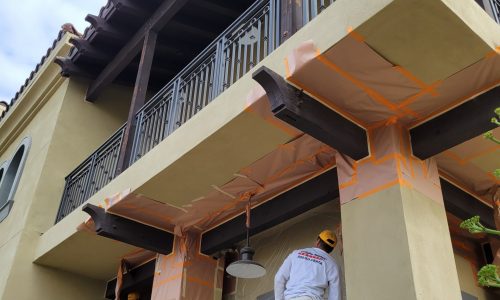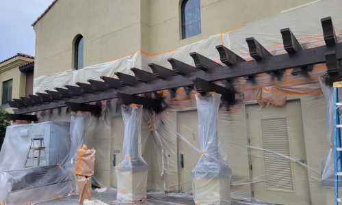 The project began with power washing all wood trim to remove dirt, residue, and surface contaminants. Once clean and dry, surrounding stucco and metal elements were carefully masked to protect against overspray.