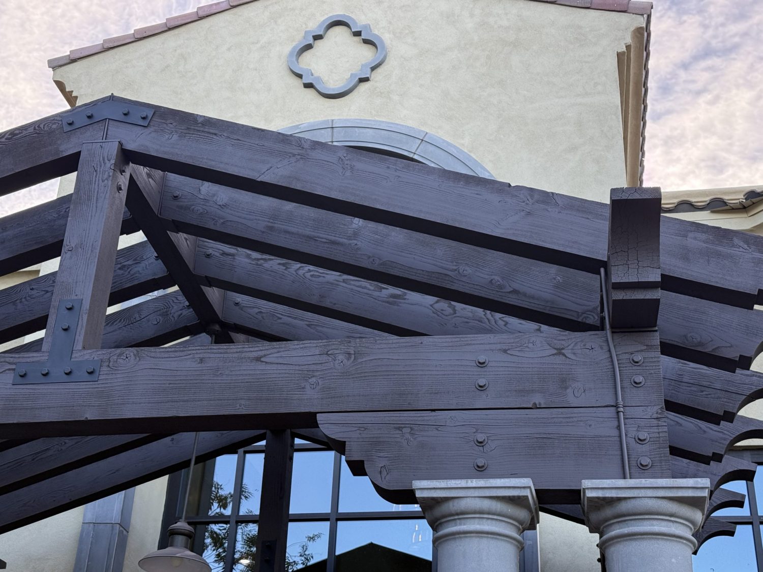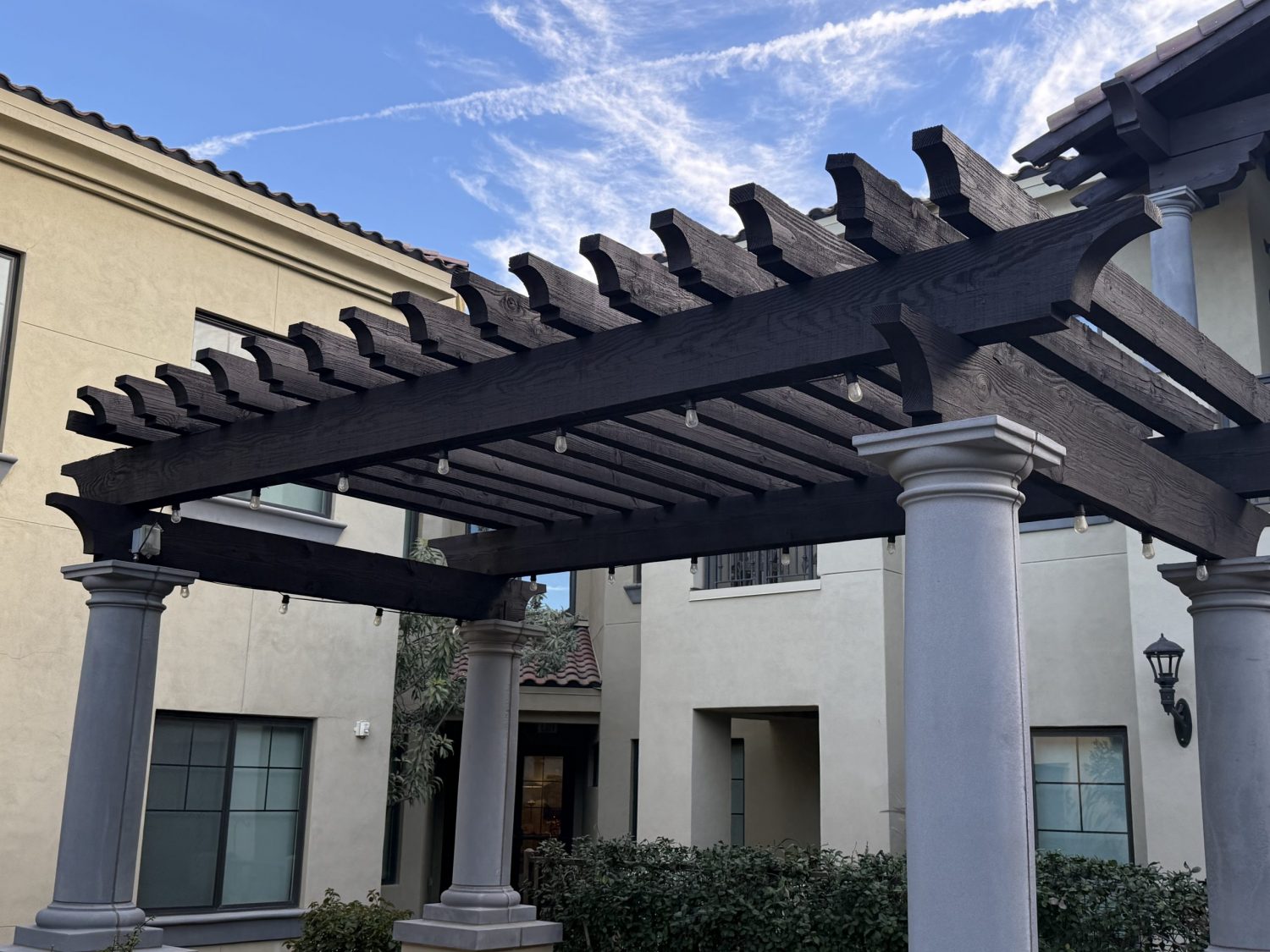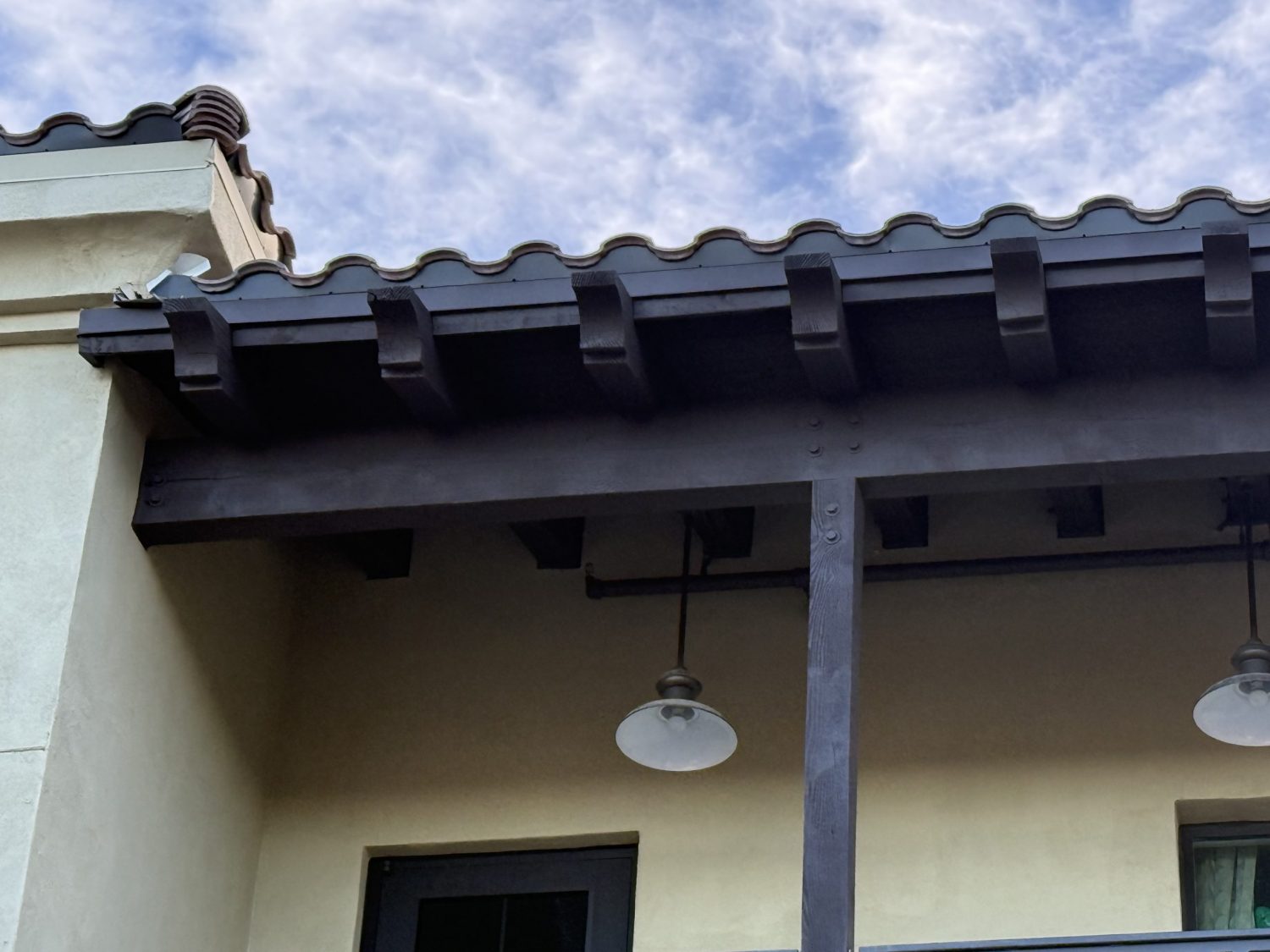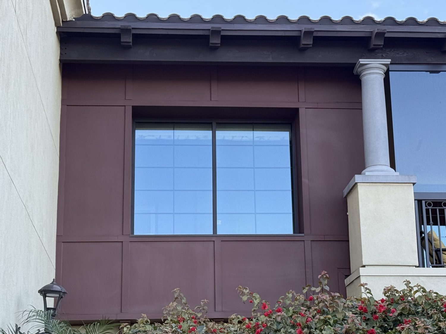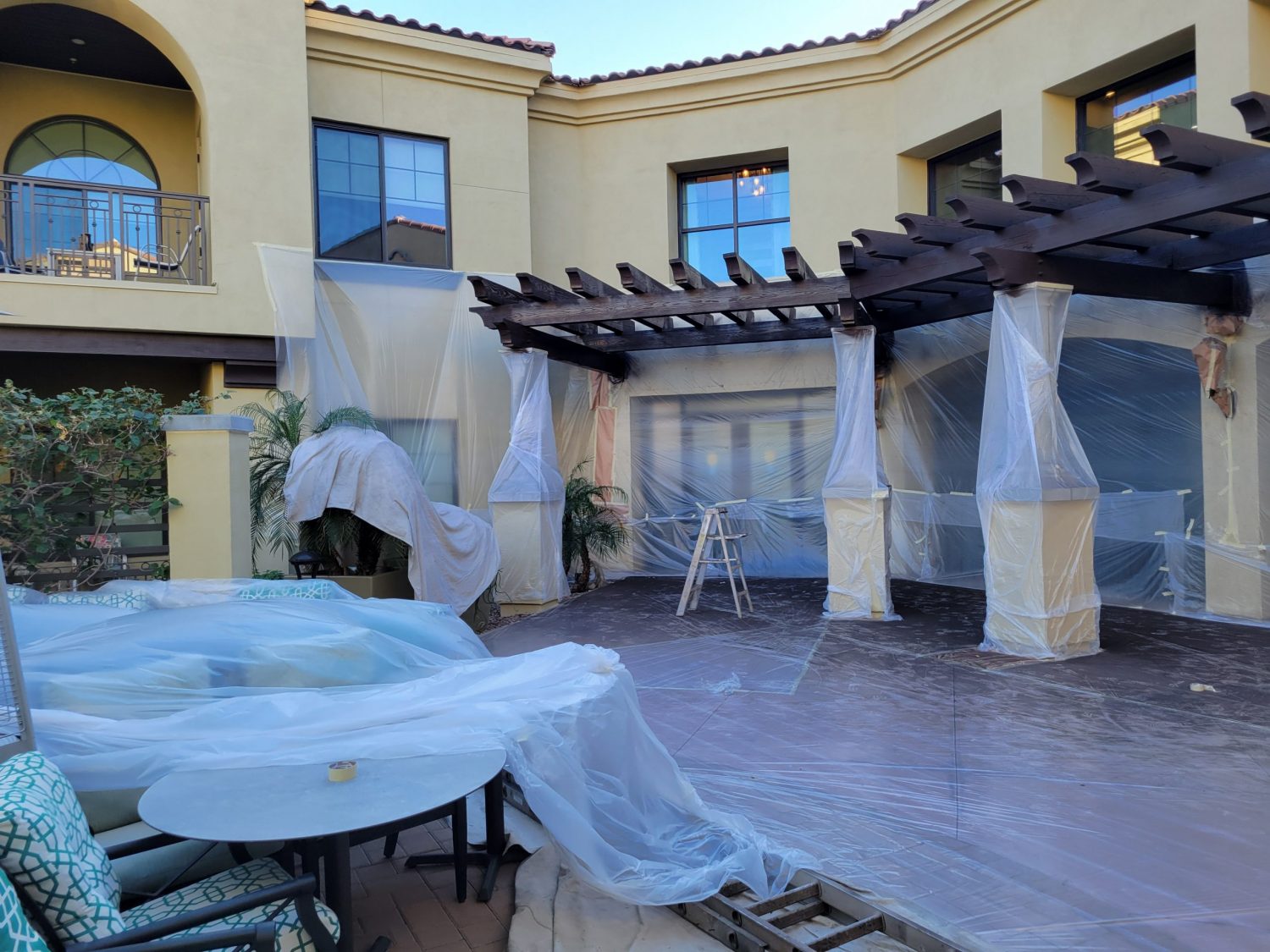 The project began with power washing all wood trim to remove dirt, residue, and surface contaminants. Once clean and dry, surrounding stucco and metal elements were carefully masked to protect against overspray.
