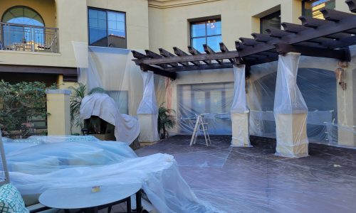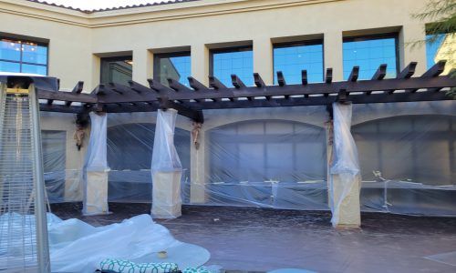 All of the wood trim surfaces were power-washed to remove dirt and surface contaminants. The surrounding stucco and other features were carefully masked to protect from overspray, and the crew worked efficiently to maintain safety and minimize disruptions to the Clearwater at Pinnacle residents.