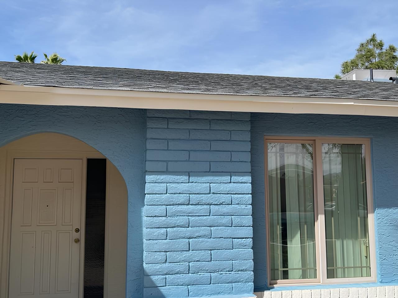After consulting with the homeowners and considering the unique architectural features and landscape of the property, we decided on a vibrant blue for the main exterior with clean white accents. This color combination was chosen for its ability to reflect sunlight more efficiently, which is crucial in the sun-drenched environs of Maricopa County. The blue offers a striking contrast against the desert backdrop, making the home a standout feature in the neighborhood.