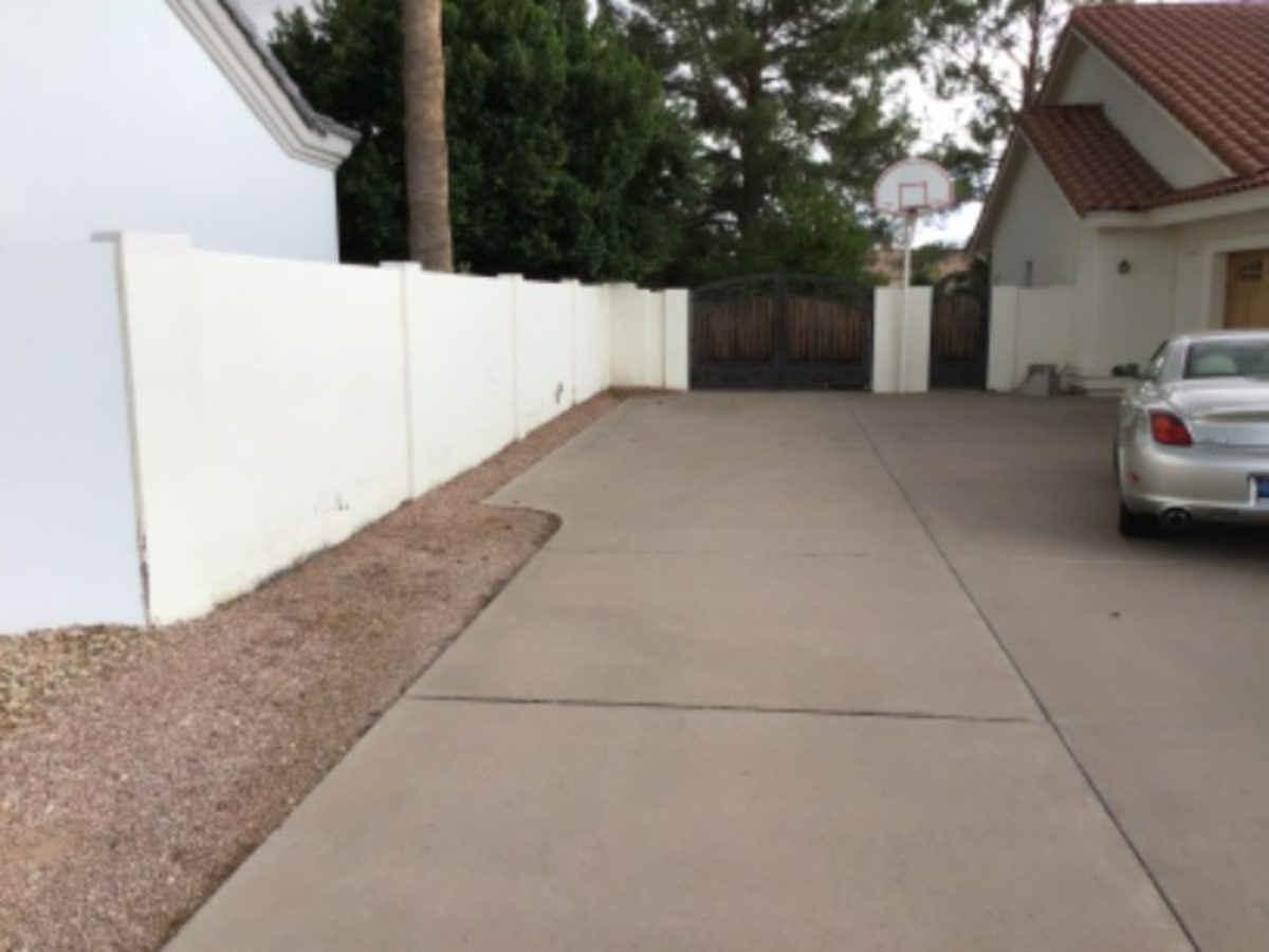 Painting – The metal was given a DTM semi-gloss paint. Two coats of stain were applied to the wood on the garage doors & wood gate. A subsequent two coats of exterior paint with a flat sheen were applied to the driveway wall and exterior stucco surfaces.