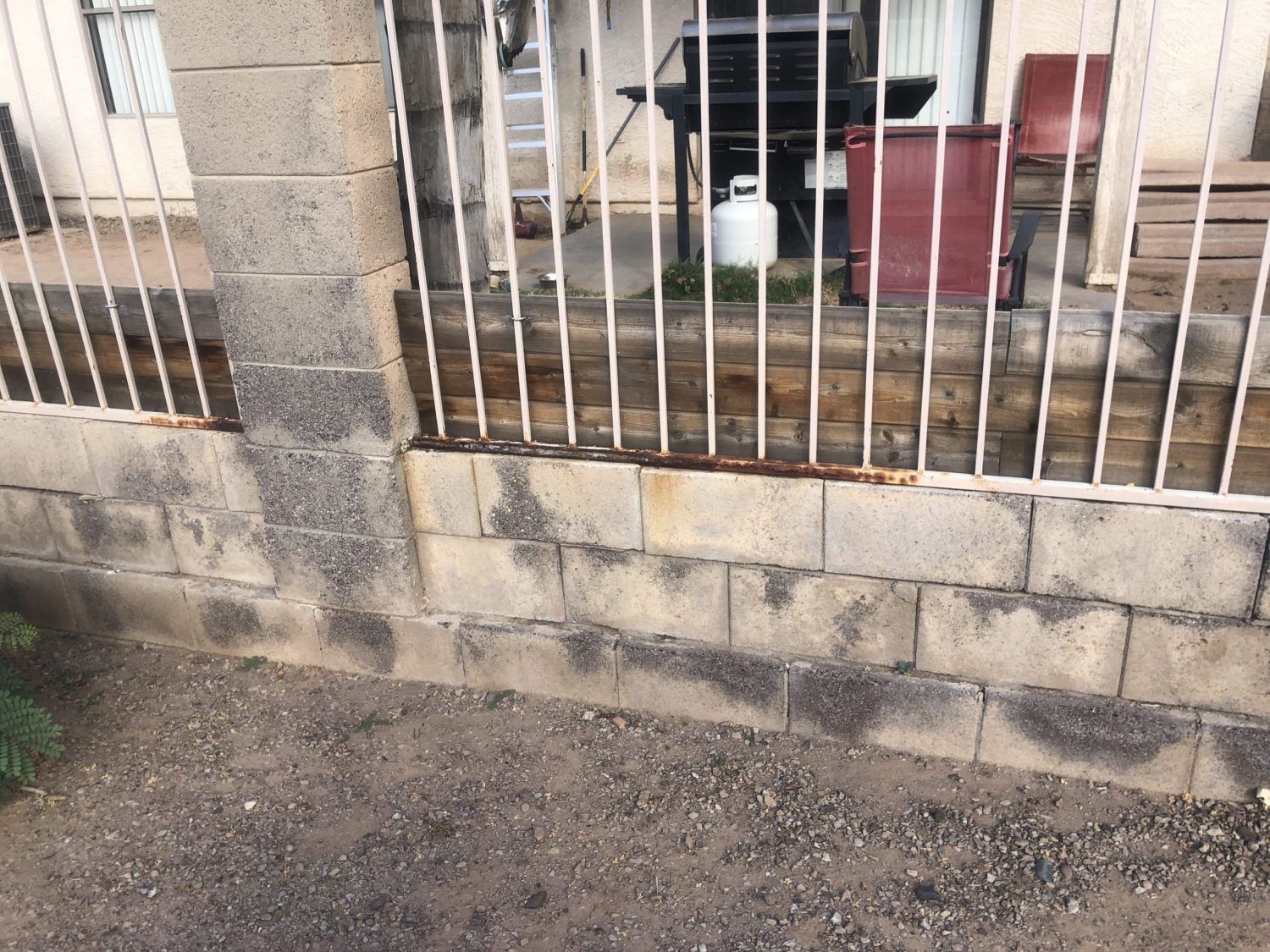 The community walls and iron have faded over the years. The two-color scheme had faded into a one-color look. There was moisture damage to many of the lower courses of the block, due to water intrusion from the resident side. The wrought iron was faded and chipping.