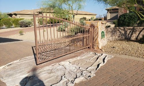 The community vehicle gates were left open during the project. All stone columns were masked prior to painting to reduce the chances of overspray. The crew handled traffic coming through the gates. Tarps were laid on the entrance deck under the gates to reduce overspray.