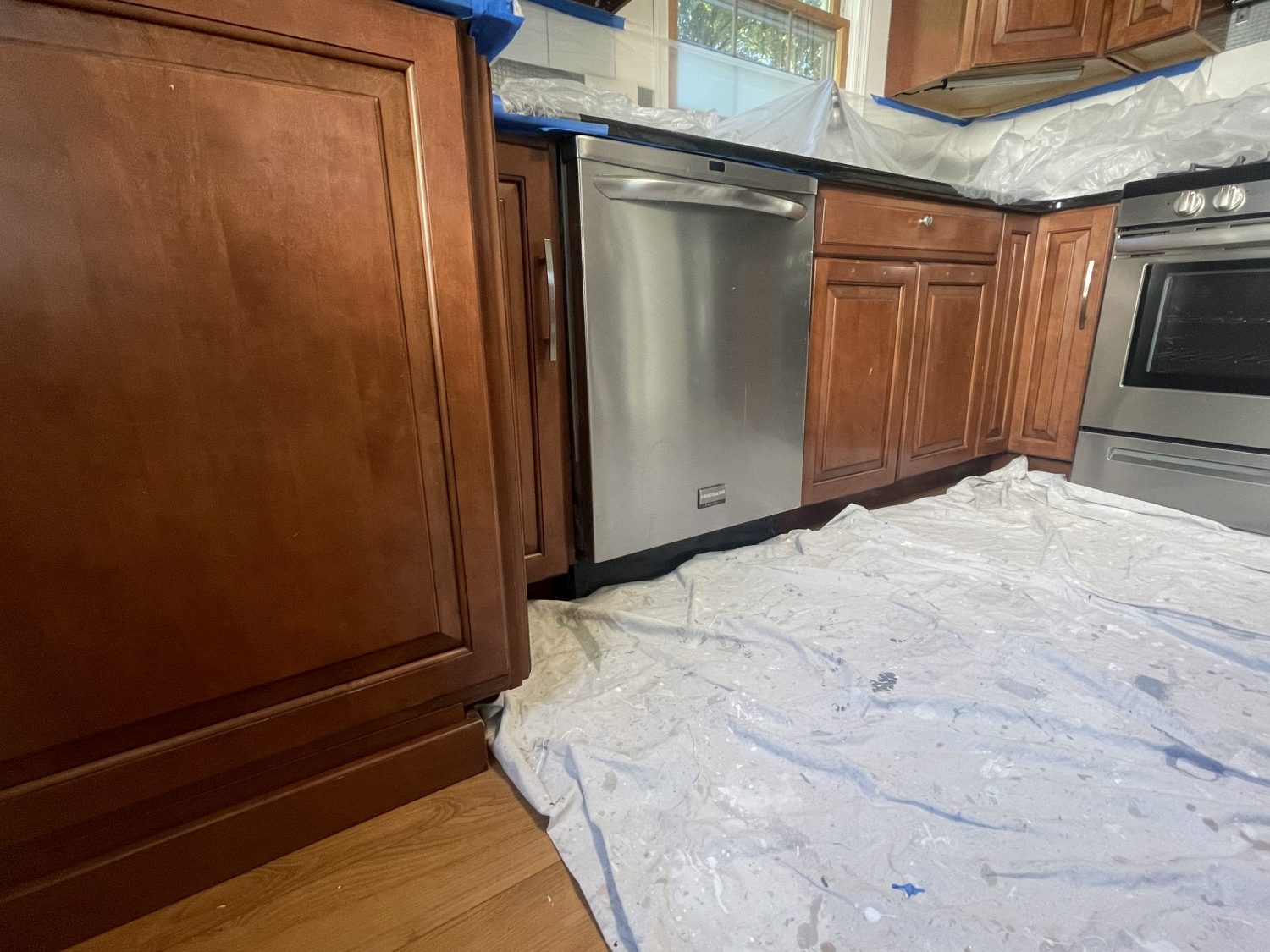 We always lay drop cloths to protect any area from paint.