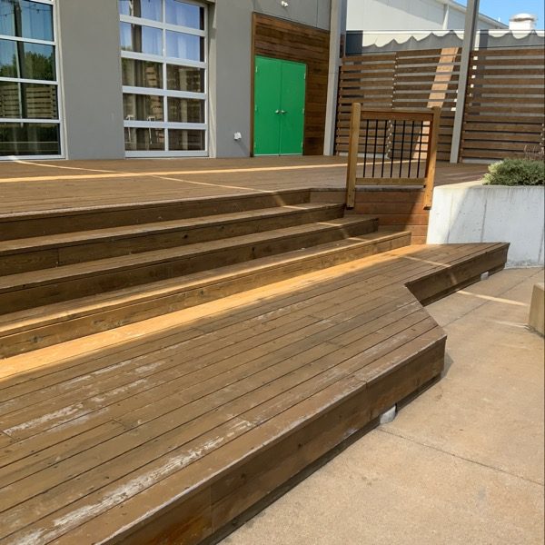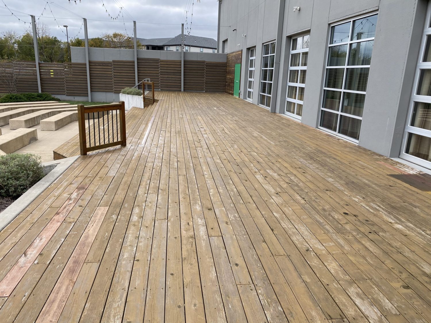 Once the front area was finished, our team began working on the church’s back walls and its deck areas. The wood walls and deck of the church had been stained in the past, but was in need of fresh coatings. We started this portion of the job by using a wood cleaner and conditioner and power washing all of the walls and deck surfaces. After all the back areas were prepared, the crew applied stain to all wood surfaces. Since the temperatures were starting to get colder and the products could only be applied in temperatures 50 degrees or higher, our crew had to work around the weather climates and look for days when the temperatures would be appropriate.