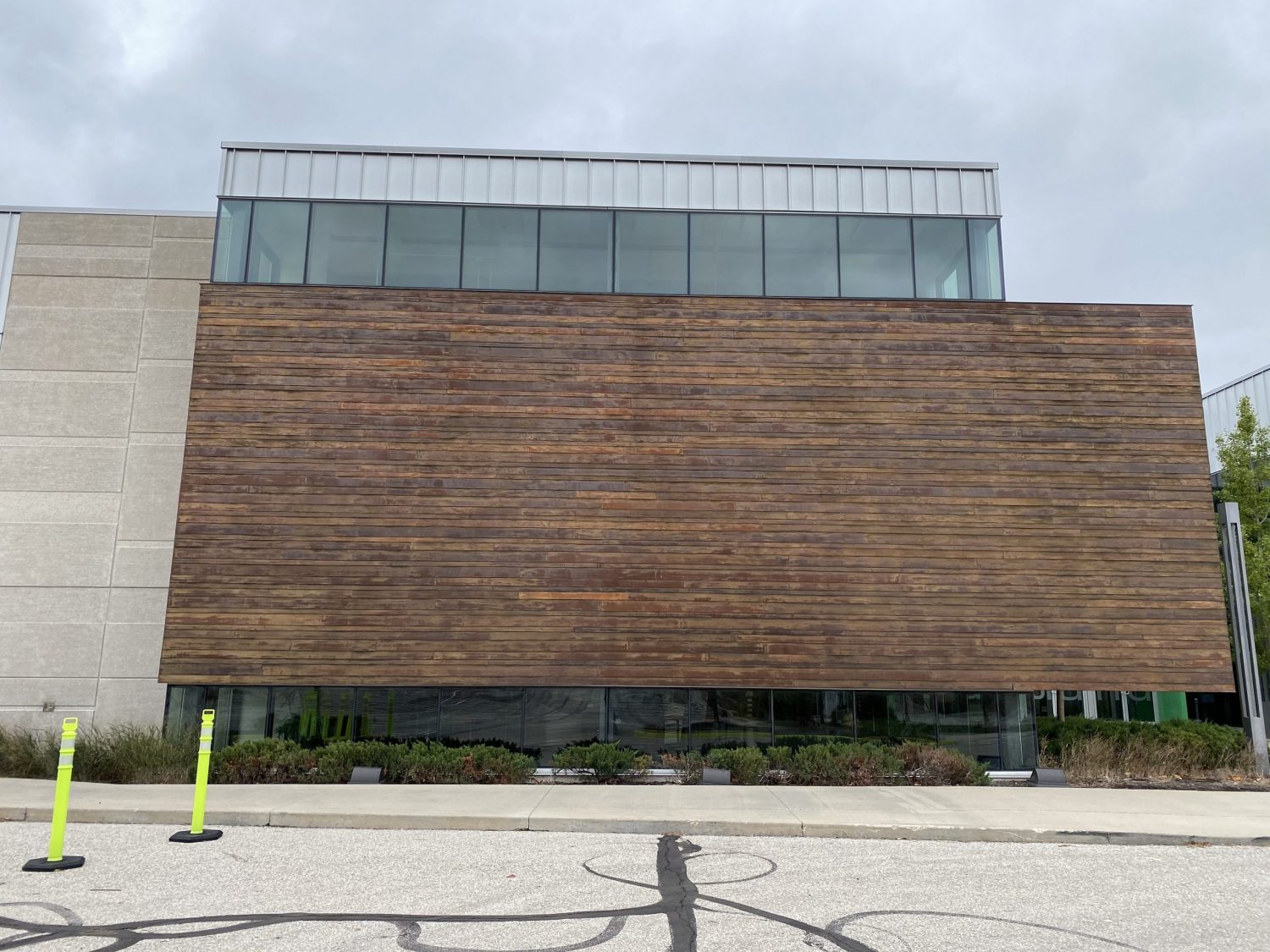 Process: Our commercial painting team began the project by sanding down all of the exotic Cumaru wood on the large facade of the building back to its bare wood. When the sanding was completed, the crew cleaned the wood and applied a one-coat oil-based stain. The job required a 45 ’ boom lift as well as power equipment to sand off all of the old coatings on the Cumaru wood walls.