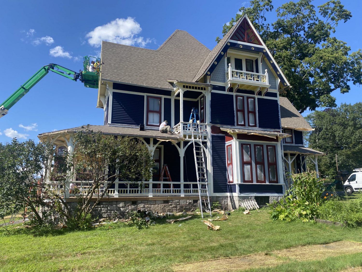 This beautiful victorian in Bristol received a complete multi-color repaint. This required a good deal of prep and a hydraulic lift to get to every bit of the work space. The prep work involved scraping, wood replacement, priming, and sanding to make sure it was 100% ready to receive a fresh coat of paint. Take a look at a few of our “during” photos to give you an idea of the scale of this residential repainting project.