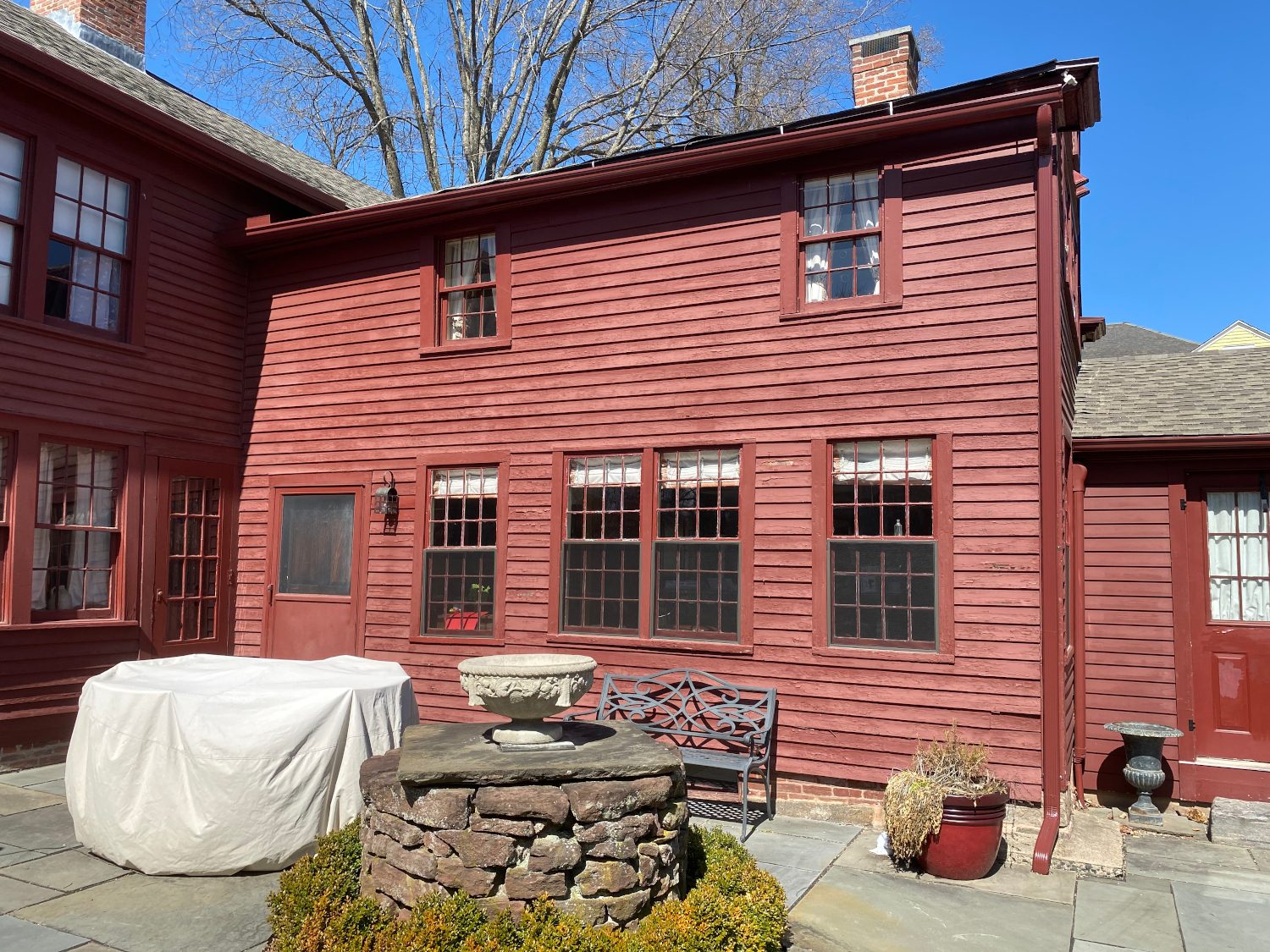 After completely prepping the exterior surfaces, washing, scraping, and sanding as needed, a very high-quality paint in a period-correct shade of dark red was applied. The paint itself was Sherwin Williams Duration Paint. This product is a long-lasting advanced paint that is self-priming and mildew resistant. A satin finish was chosen to give it just enough of a sheen to make it say “Curb Appeal Circa 1750”. The end result speaks for itself.
