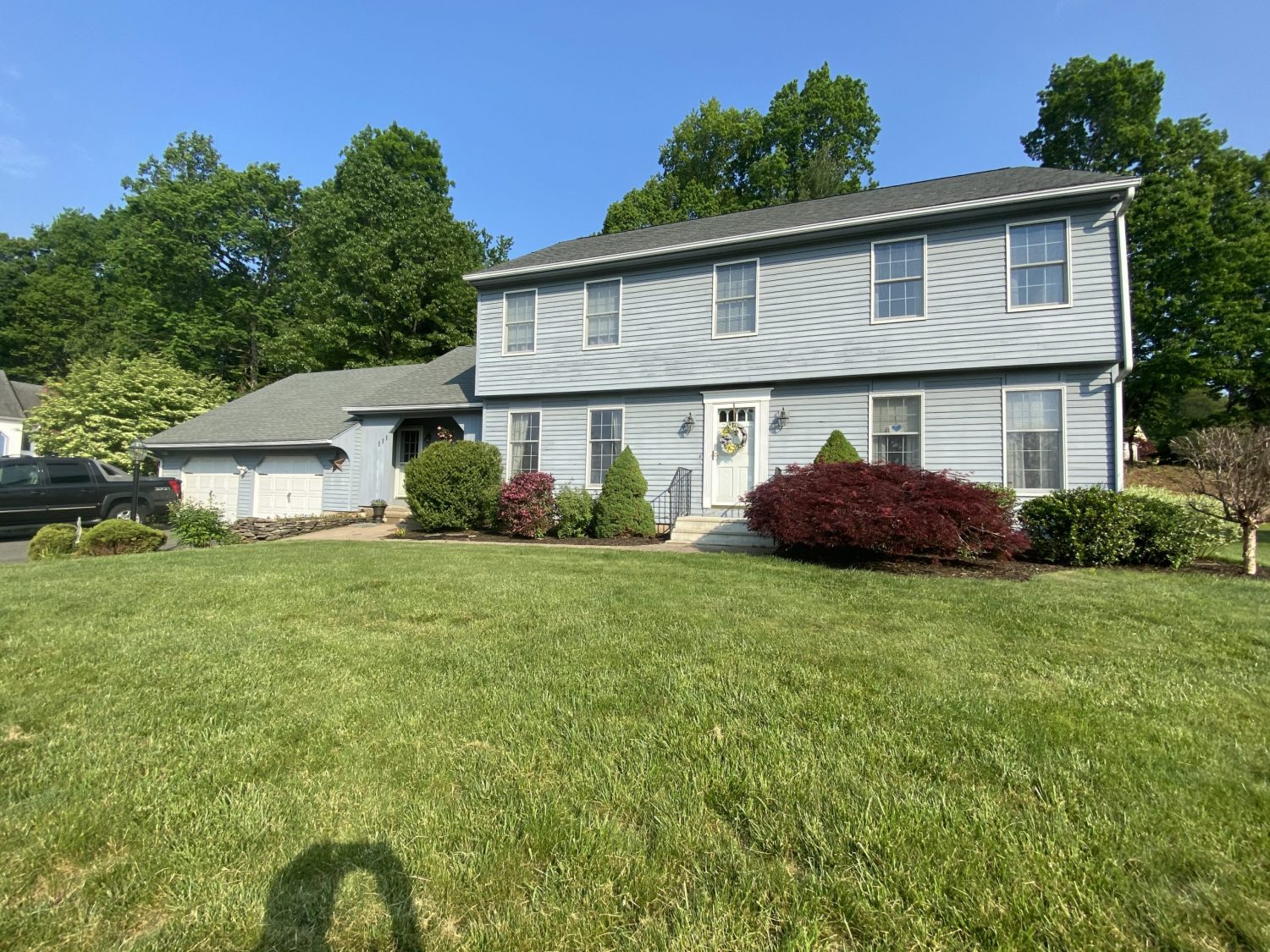 While it’s best to stick to fairly light colors when painting vinyl siding, you are no longer stuck forever with the original shade of the siding your house was clad in. In the case of this colonial in Plainville Connecticut, the owner chose to keep the original light blue. They were thrilled with the results and glad they chose the faster and much more affordable option.