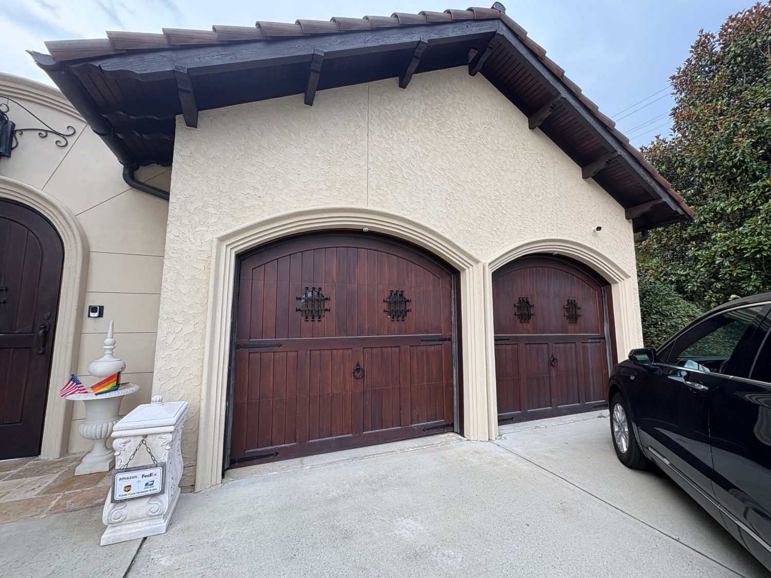 Project: In late Summer of 2025, CertaPro Painters® of South Charlotte, NC was hired to refresh the exterior doors and soffits of a nearby stucco home in Charlotte, NC. The wood surfaces were previously stained but had become weathered over time, with minor damage and uneven, faded color in some areas. The owner wanted to restain the garage doors and soffits, while also repainting the front door a rich red color.
