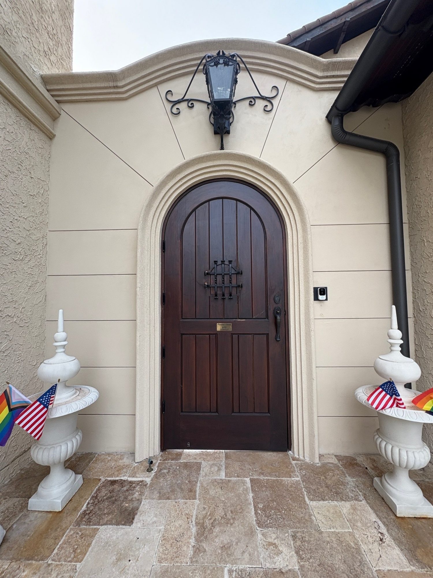Process: Our work involved stripping the garage doors of their previous coating and re-staining. The front door was stripped, cleaned, primed, and painted. Soffits around the exterior of the home were also scraped and re-stained.