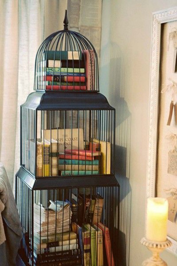 You can find large, vintage birdcages at antique shops and even thrift stores. Obviously you need one with a large opening in order to store your books.