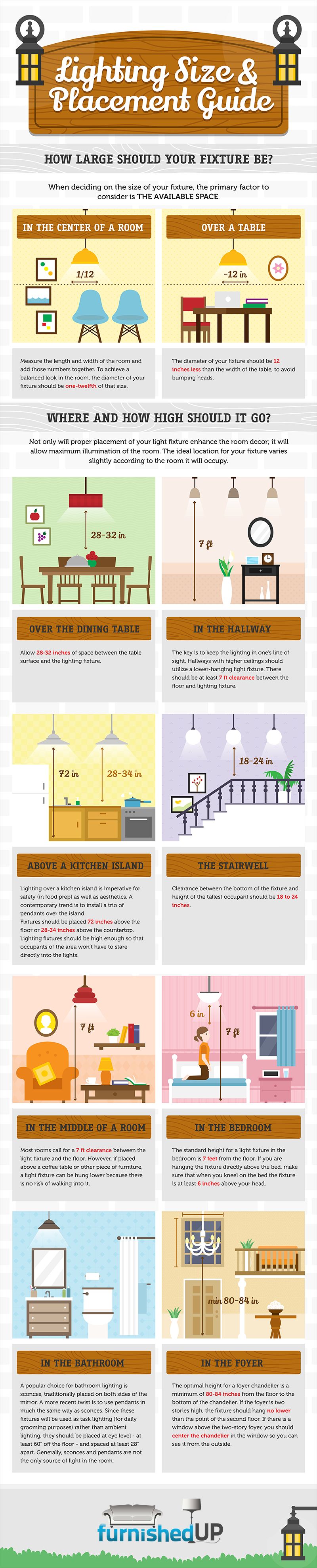Light fixtures can take a space from dull to design instantly. The smallest changes can bring your entire space together. This infographic is a great guide to picking the right size fixtures for your space, as well as how and where to place them. We recommend getting a professional to do the installation for safety purposes and best results.