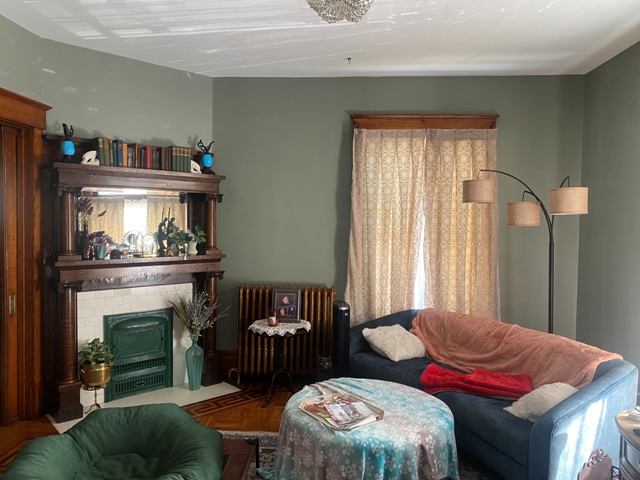 Interior: Your furniture and décor are placed in the center of the room, covered with new plastic, and all flooring is protected with drop cloths.