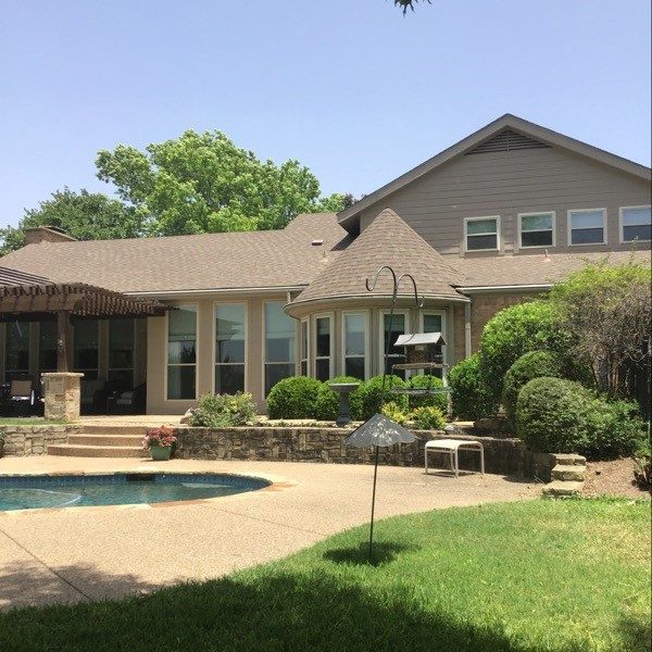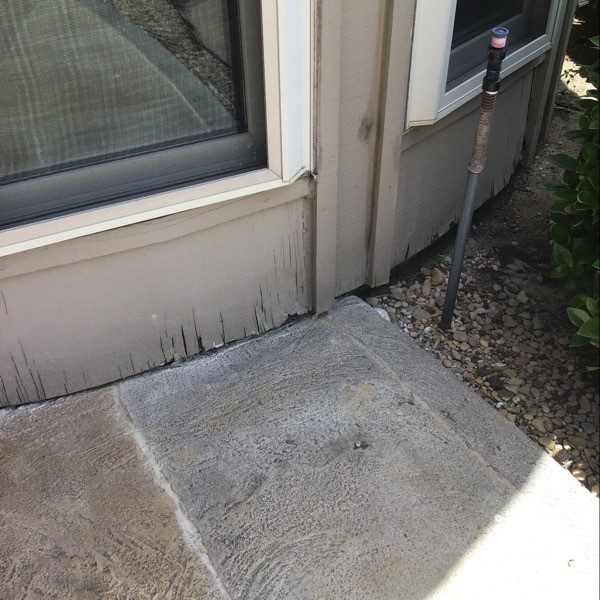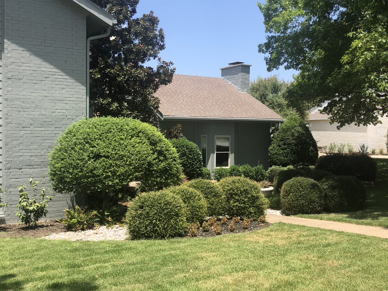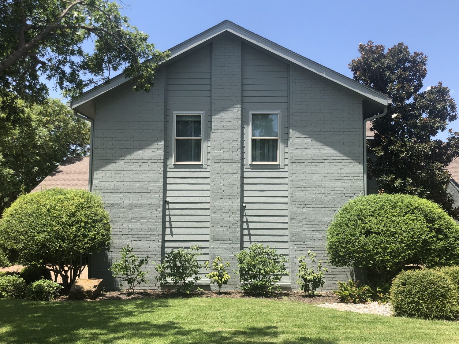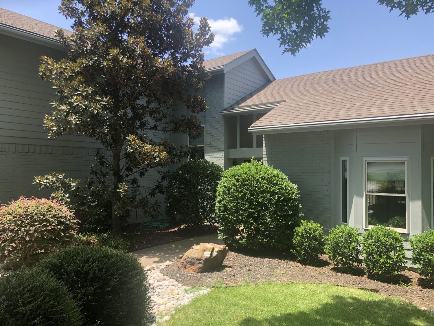 The entire home was power washed to ensure clean surfaces, and we replaced a few panels of wood that were rotted. All the unpainted brick was primed with a masonry primer, and then home was painted with a new color. The front door was painted with an accent color, and as a final step, we restained the rear pergola.
