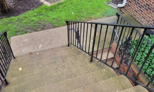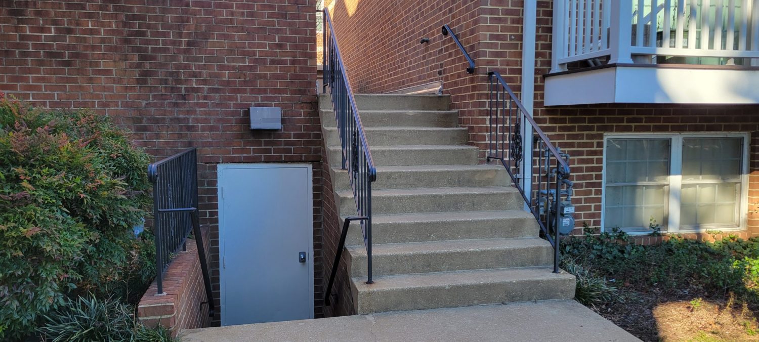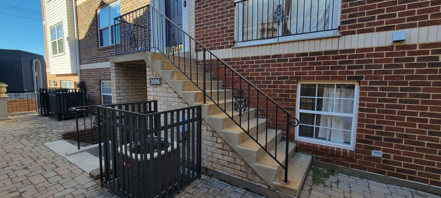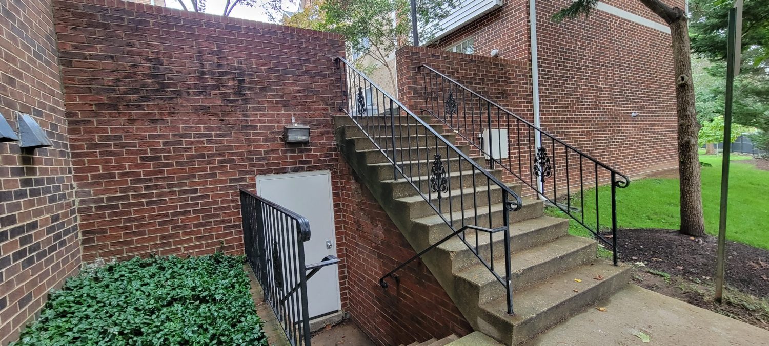 At the start of the project, several high-traffic and highly visible areas of Arlington Ridge Terrace showed signs of wear and deterioration. The central plaza and the interior of the parking garage had accumulated dirt and grime and required thorough pressure washing. Many painted metal surfaces throughout the community, including individual unit garage doors, exterior entry doors, railings, and lamp posts, exhibited peeling paint and areas of spot rusting. In some locations, railings were missing paint entirely, detracting from both the appearance and protective coating of the metal surfaces.