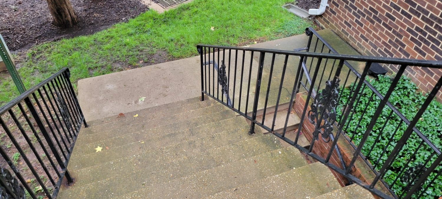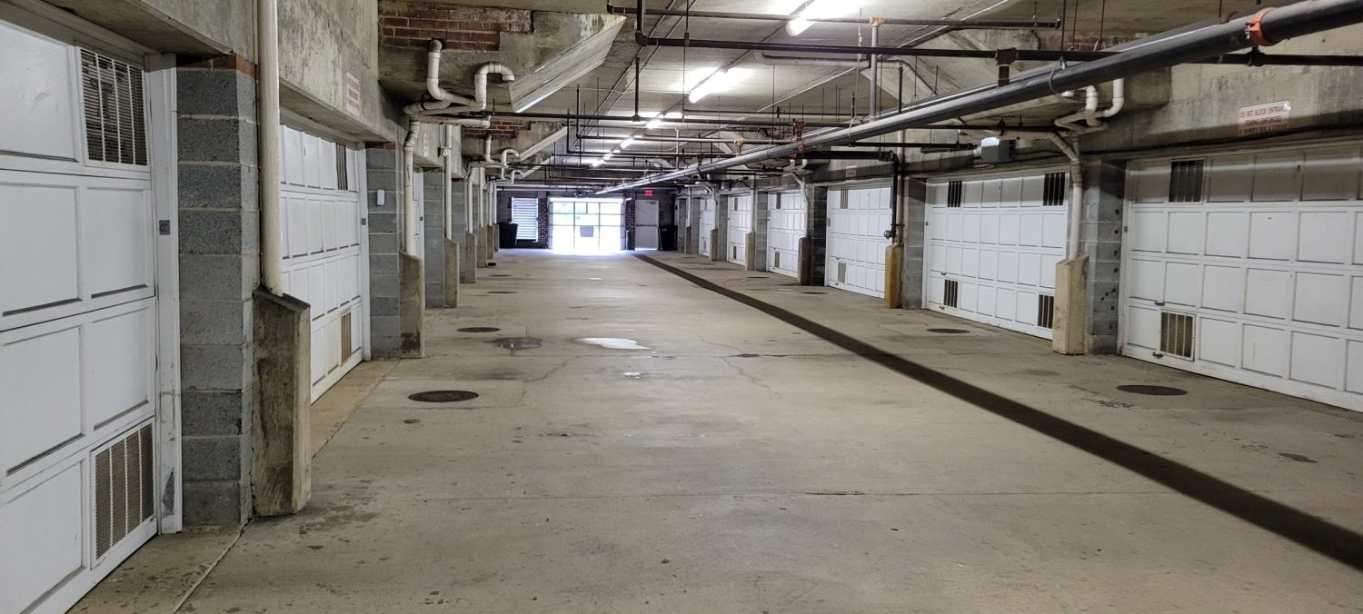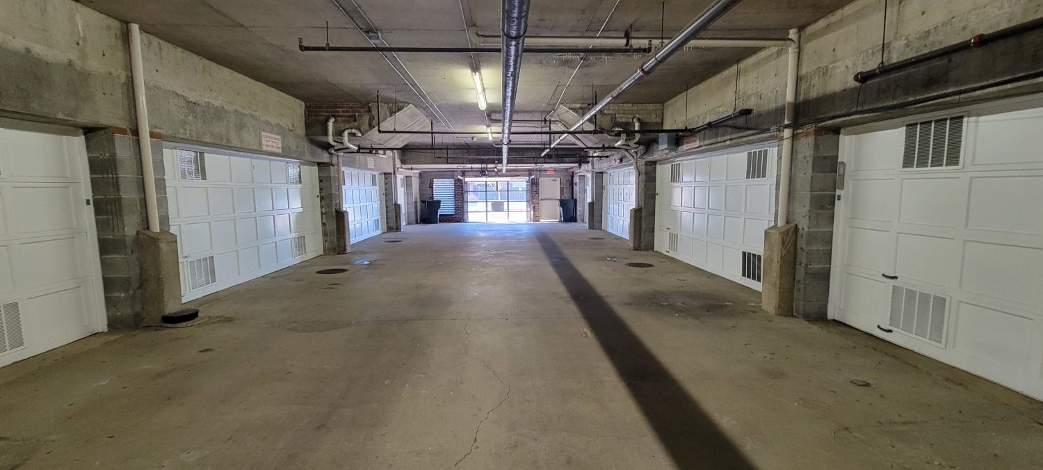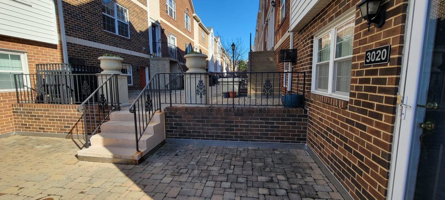 At the start of the project, several high-traffic and highly visible areas of Arlington Ridge Terrace showed signs of wear and deterioration. The central plaza and the interior of the parking garage had accumulated dirt and grime and required thorough pressure washing. Many painted metal surfaces throughout the community, including individual unit garage doors, exterior entry doors, railings, and lamp posts, exhibited peeling paint and areas of spot rusting. In some locations, railings were missing paint entirely, detracting from both the appearance and protective coating of the metal surfaces.