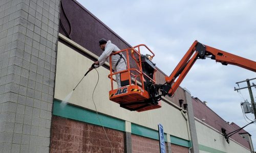 The building, a large grocery store, is in operation from 8am to 9pm, seven days a week. The building exterior extended up to 35 feet in some area, so a 45-foot boom lift was rented to reach the higher areas of the building. The building conditions along with winter weather conditions presented a number of challenges. The surface of the building is a combination of masonry and stucco that has a multi color layout. The manager wanted the building painted even though it was nearly the start of winter. He hoped good weather would allow the team to finish prior to the Christmas holiday.